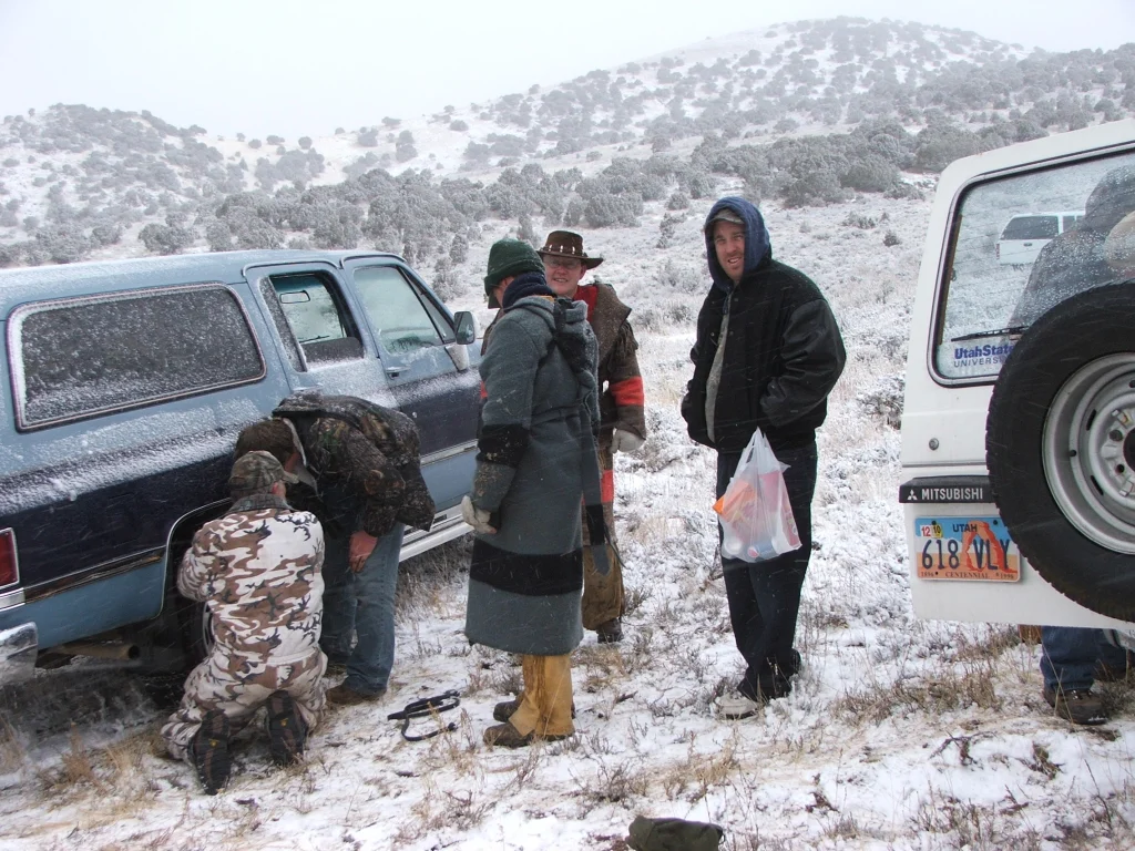 We had a mishap right off the get go. Fat Duck, who was pulling Hunters trailer left his home and started up the North Ogden divide and had not gotten more than a mile or so up the canyon when his Ford truck died! There he was nearly in the middle of the road blocking all of one lane and part of another. He tried to pull into a wide area off the side when he realized the truck was going to die, but didn’t make it. Tracker, Many Steps and I were going to meet him up at the turnoff toward Monte Cristo, but we got the call about the time we got to 5 points in Odgen. We turned around and headed for the North Ogden Divide. Arriving some 20 minutes later, Tracker used his rig to assist in getting Ducks outfit off the road and into somewhat of a safe spot. We thought we knew what the problem was, because it happened up on the regular muzz hunt. So we changed out a fuzz that does something with the fuel and all the electronic B.S.’n sensors and when he turned on the key, POP it went again. 3 fuzzes later he called a tow truck.