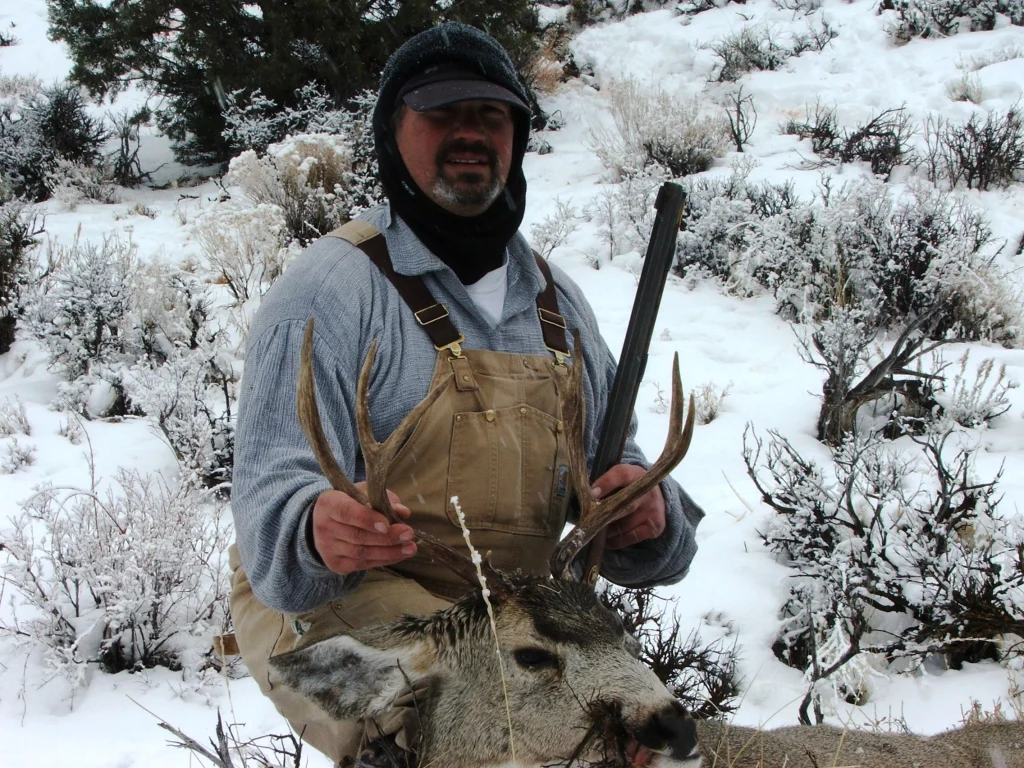 We did our pushes and to everyone’s surprise no bucks were seen at all. In fact in the mile or so of my hike alone I never saw one deer. But then it was foggy and that may have been the reason for not seeing anything. We gathered at the truck and headed back toward the ravine. Moving up the bottom of the ravine, we spotted a 4X4 buck feeding up on the hillside about 50 yards. Not a bad buck as muley bucks go, just not the caliber of buck that we had been seeing.