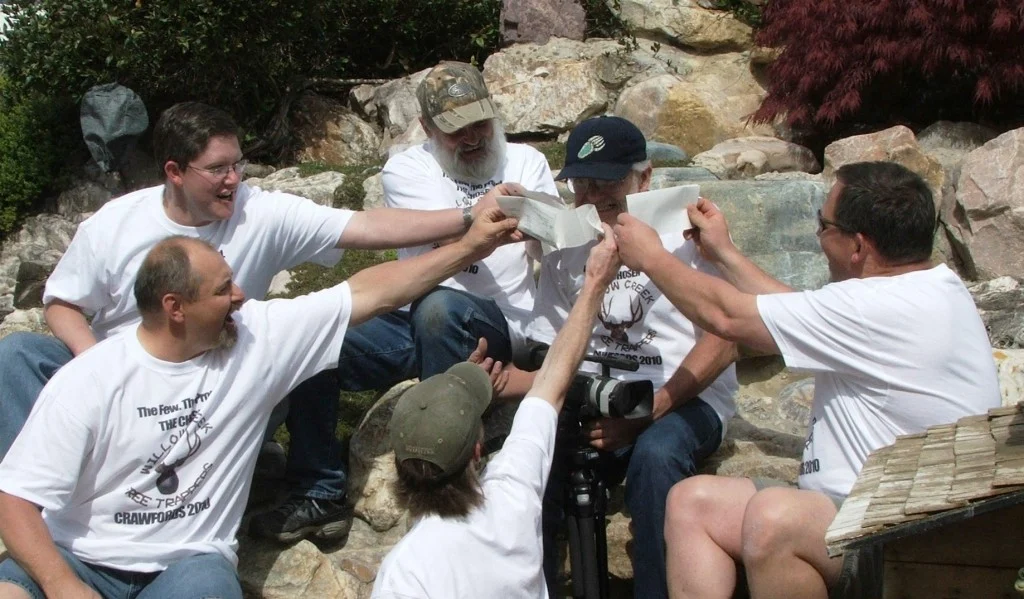 It wasn’t long before the Chosen Ones decided they needed a “prop” and chose to have t-shirts made up that contained a picture of a large buck in the middle, surrounded by the words Willow Creek Free Trappers and on top of that the words The Few, The Proud, The Chosen and below the big buck the words Crawfords 2010. Many Steps did the design and using a big buck photo taken at a Cabellas store in Lehi, Utah and made up the words as listed. Here is what the t-Shirt looked like: