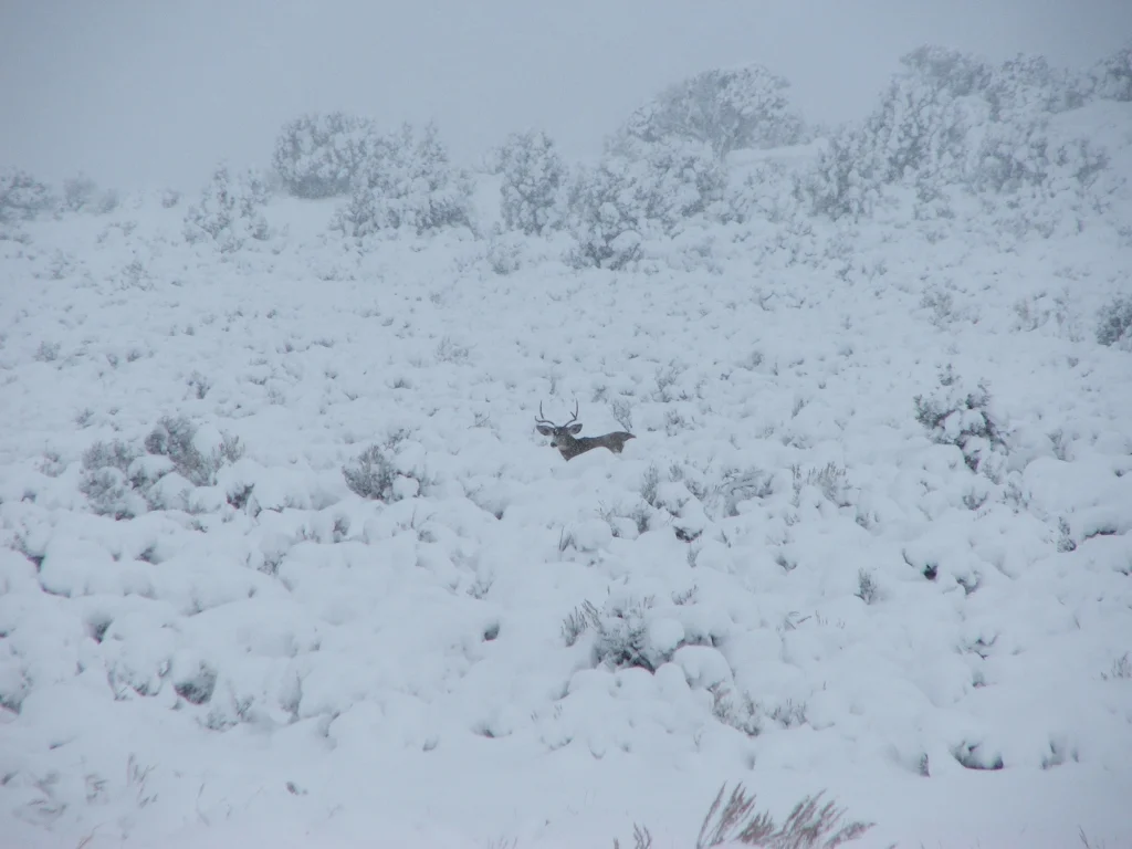 We continued our trip to the top of the ridges and proceeded down the other side. The snow was falling and the depth was getting very deep. Sometimes we were pushing snow with the differentials of our rigs and we knew if it kept up falling at its current pace, it would be trouble for us for sure. We were beginning to pray it would stop. We continued to travel as best as we could and we kept seeing a boat load of deer. No shooter bucks however, but still some nice respectable bucks. This one was trying to figure out which way Utah was in such a blinding snow storm.