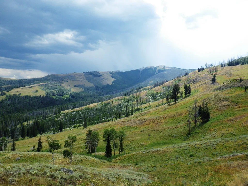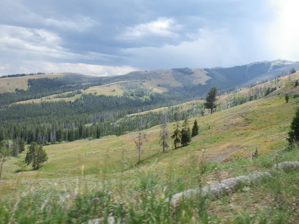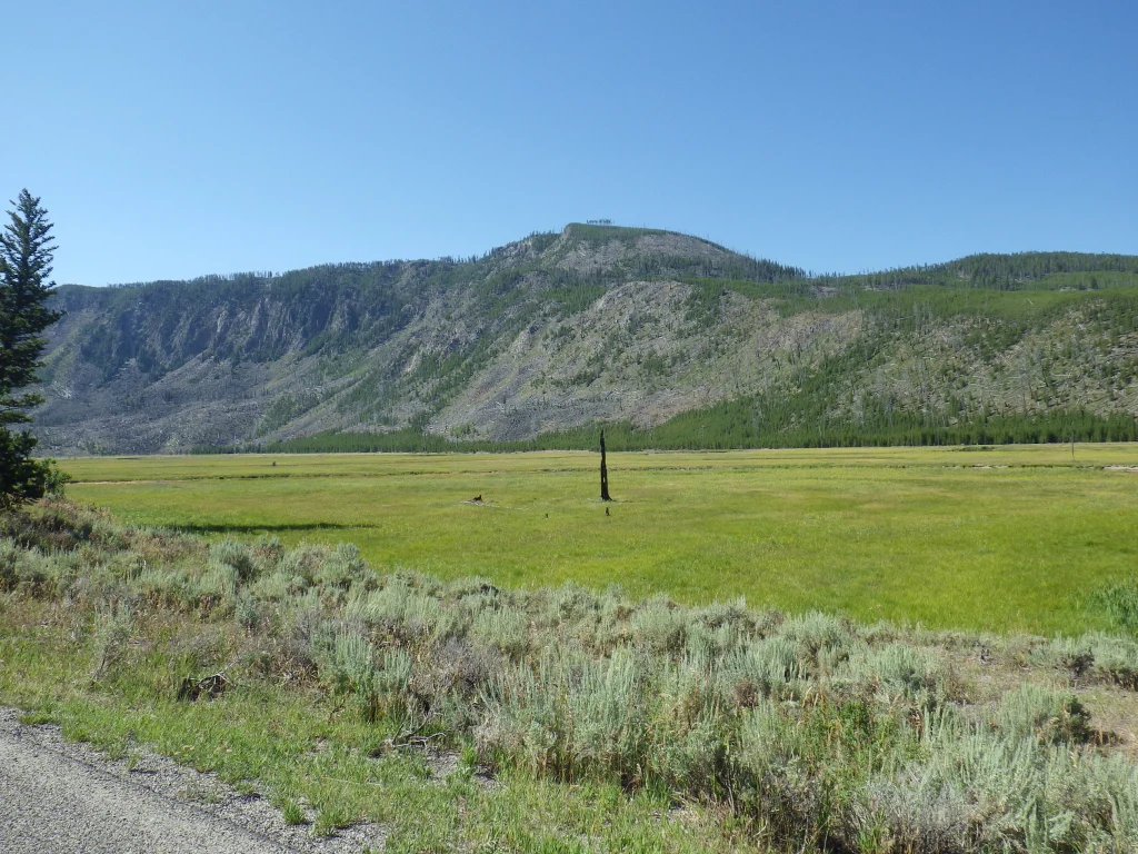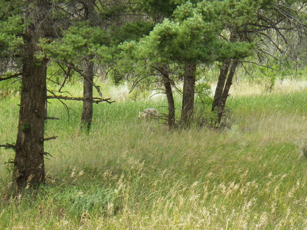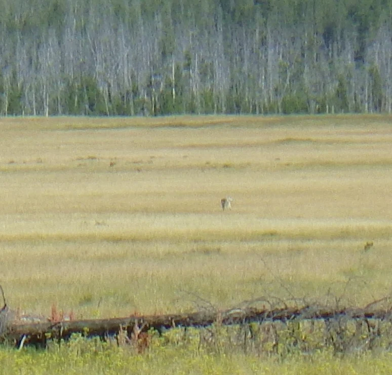A large Grey Wolf wandering across a meadow! The ranger near this spot said there had been three of them off and on and they were busy trying to get rid of an elk carcass that was out there somewhere. Other people were setting up cameras etc. in hopes of seeing a grizzly bear as well as the wolves. I don’t know if they ever saw a grizz or not. But for us, this was the most exciting animal to have gotten to see in the park! And we saw the wolf and the bear the same day! What a great day!