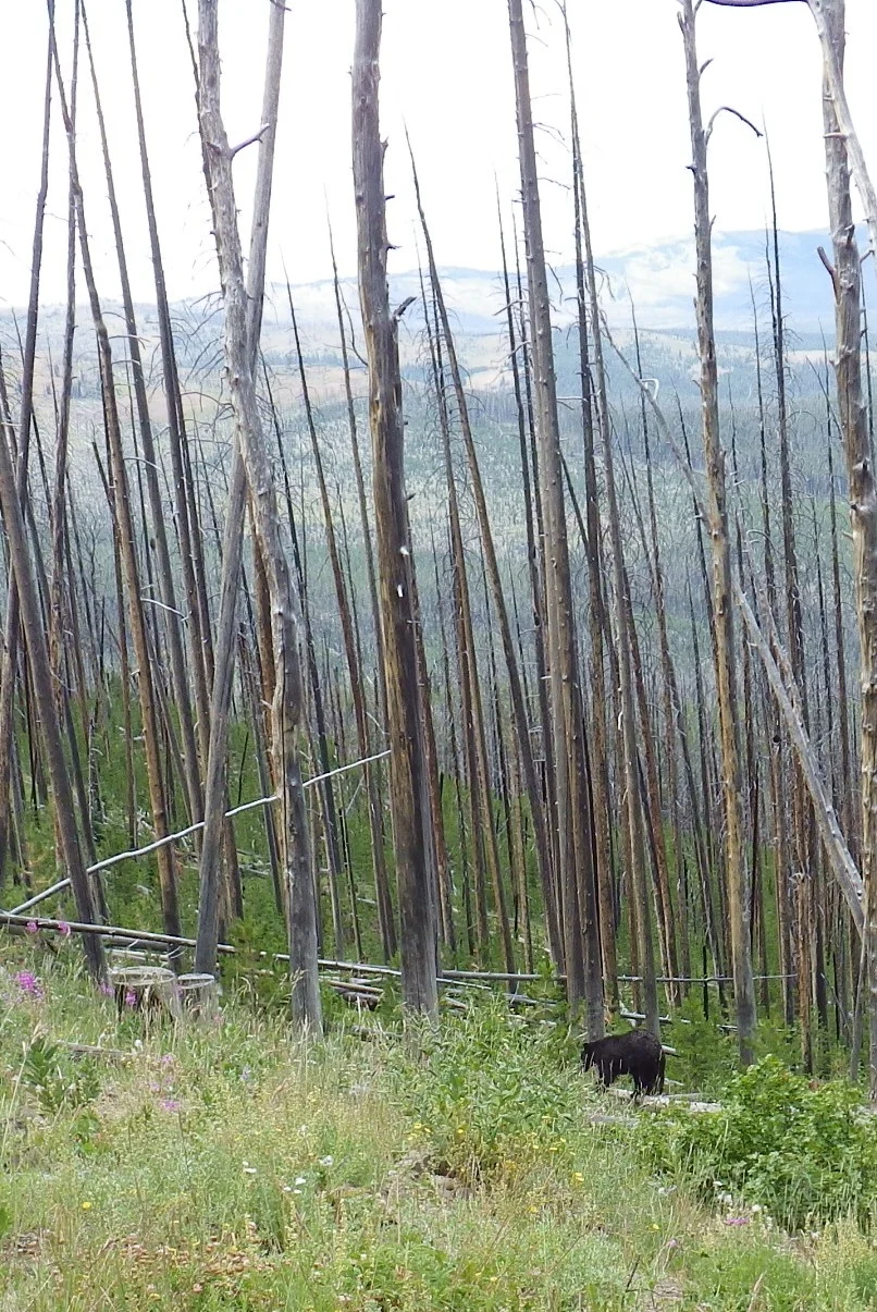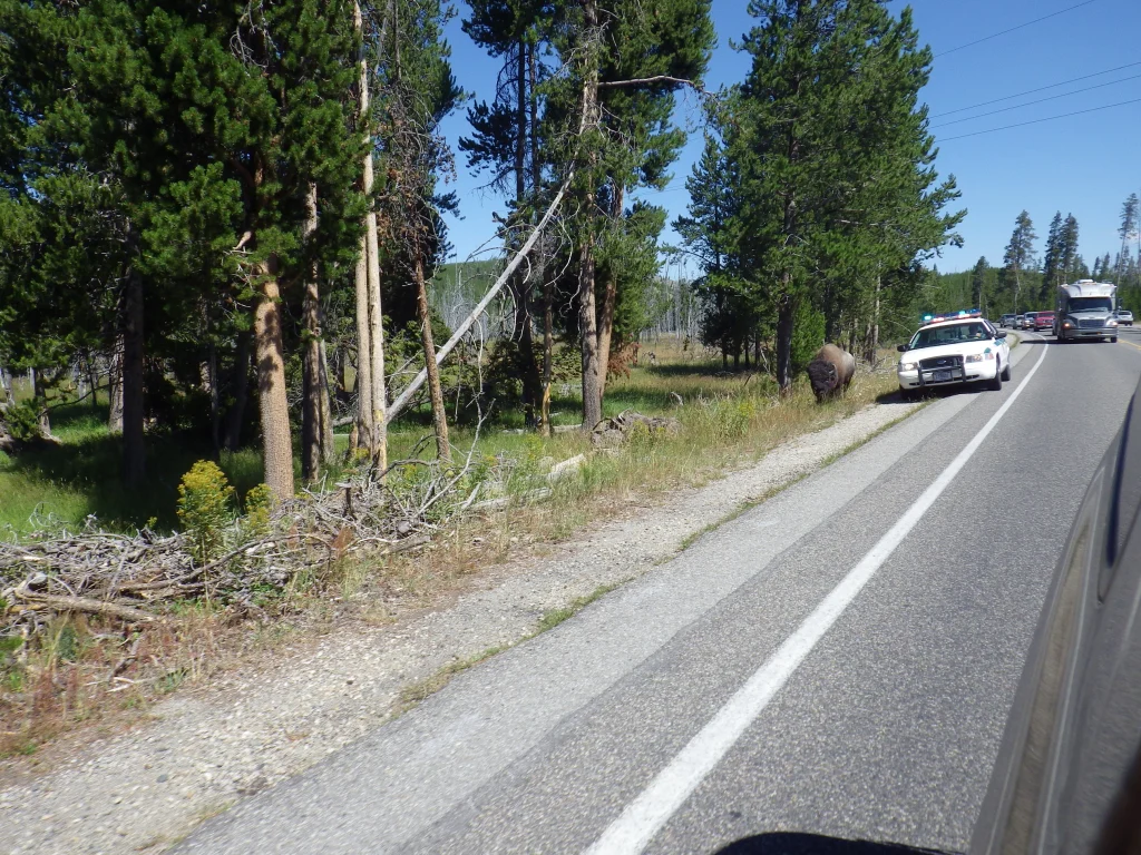 It was a rather surprising way it happened as well. Of course anytime you are traveling through Yellowstone National Park at the max speed limit of 45 and suddenly rounding a corner you are faced with a traffic jam of Yellowstone proportions…this is what happened and of course we added to the congestion with our own two rigs! We bailed out when we heard it was a bear they were viewing. I made it quickly to the edge of the road an looked way down into the trees, some 100 yards and began my search…I could not see it…then something moved right below me about 10 yards…THERE IT IS!!!!! Wholley Molley! All the signs throughout the park tell you to stay close to your vehicle and only get within 100 yards of any bear. This little guy was right under my feet. I quickly snapped a couple of photos and grabbed the youngest grandson and headed back to the car!