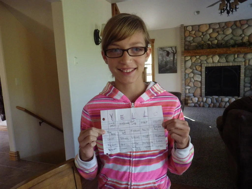 At the cabin we took the time to list each on a separate piece of paper and then made up a “bingo” like card out of paper, only we called it “Yello” instead of bingo. Here is Sydnie with her ready to go Yello paper: