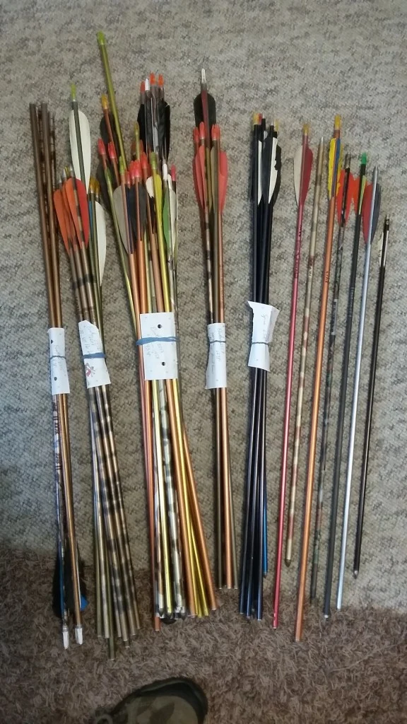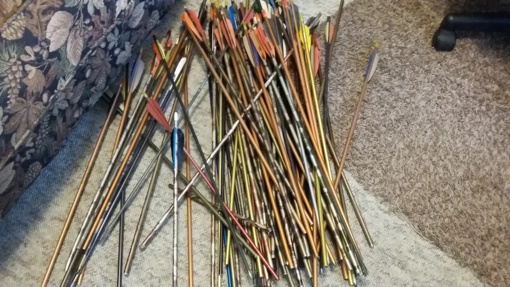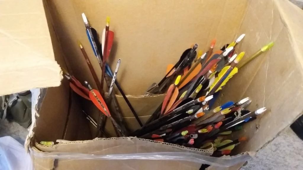 Well, I brought the arrows home and dumped them out on the floor. Not knowing if this was really worth the $5 or not. I immediately started seeing broken arrow pieces and jammed tips, bulging and bent arrow shafts….not sure about this “deal” of mine.