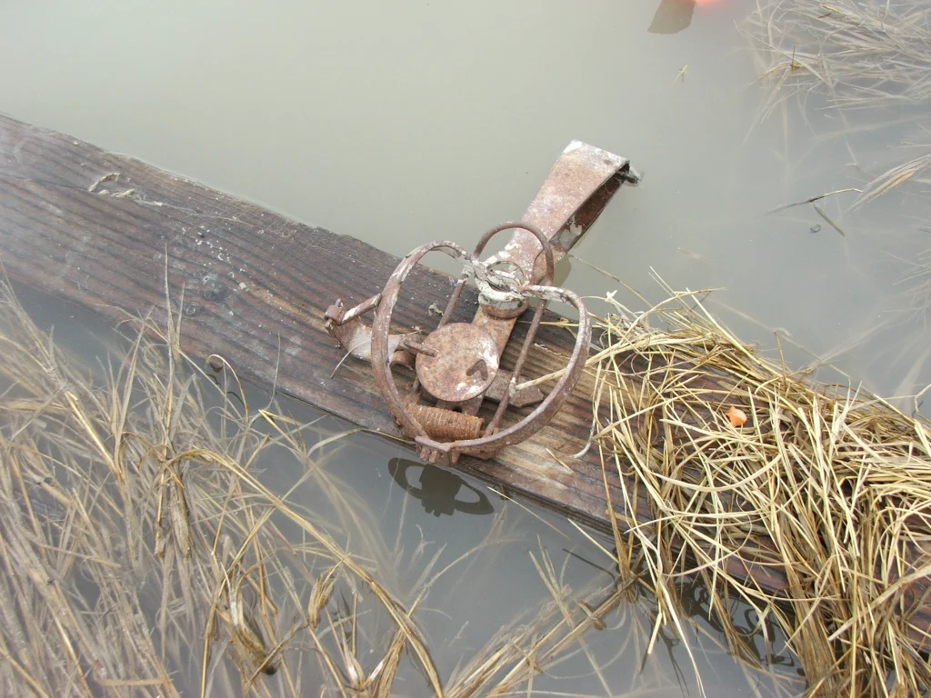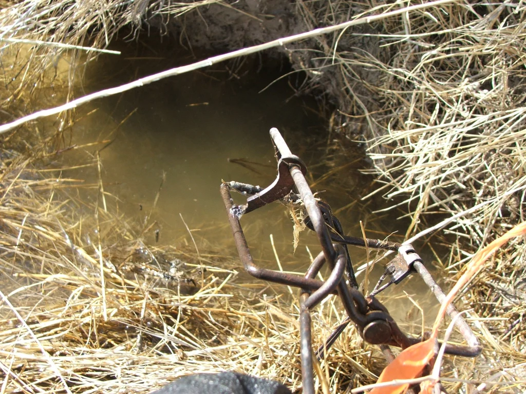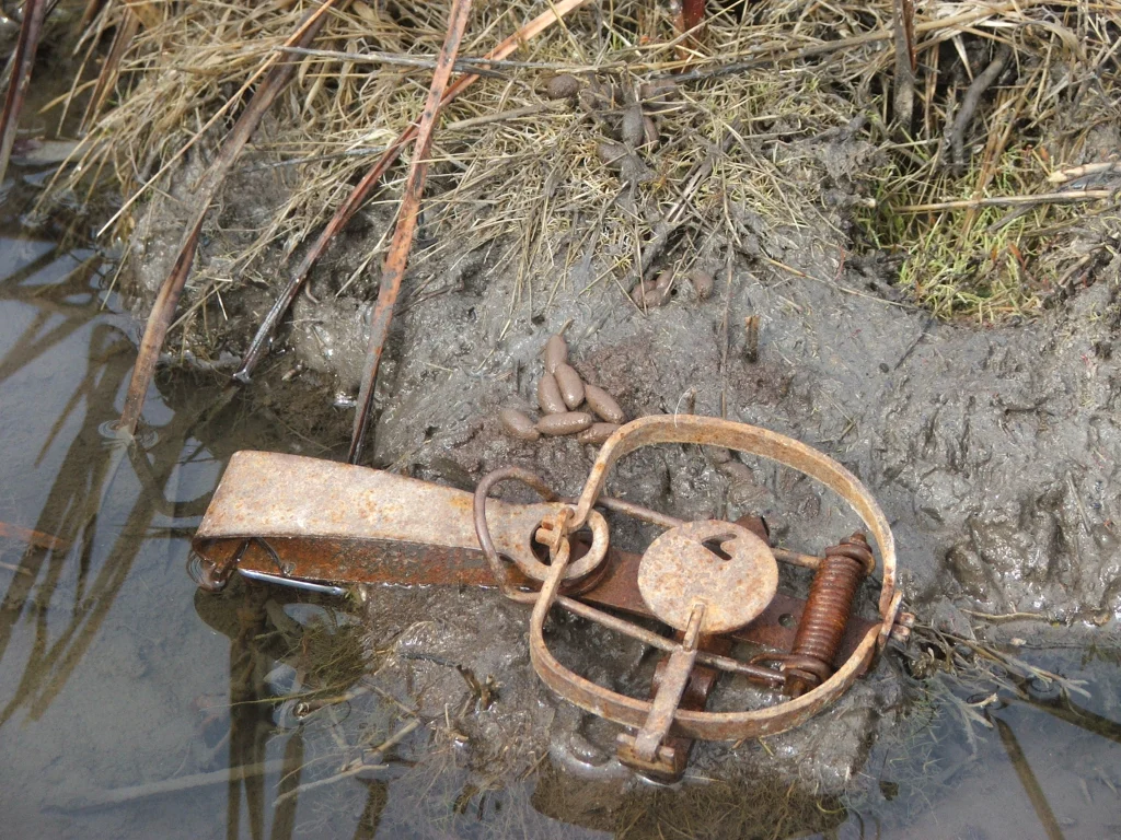You can see the trap has been sprung, the jaws started to close and because I had not cleaned off the mud on the spring side of the trap, the mud held the jaws from allowing the spring to finish closing the jaws on the unsuspecting rats leg.