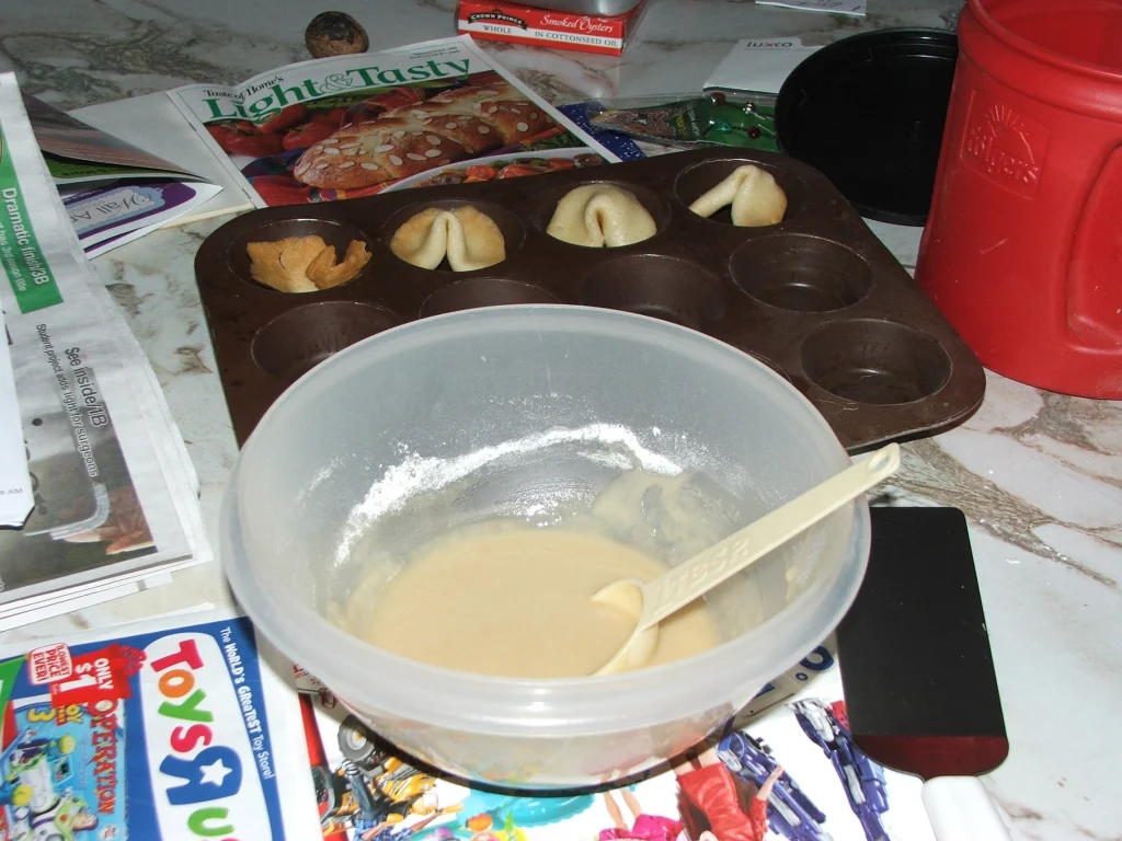 I hope you have your messages all folded up and ready to be put into the cookies, cuz if you don’t you just have 11 minutes to get two of them ready. Fold them up pretty small. Now, get out a small spatchula and an empty cup with thin walls. Get a hotpad out too. When the timer goes off and you can see the cookie has brown around the edge maybe even ½ in into the cookie they are done.