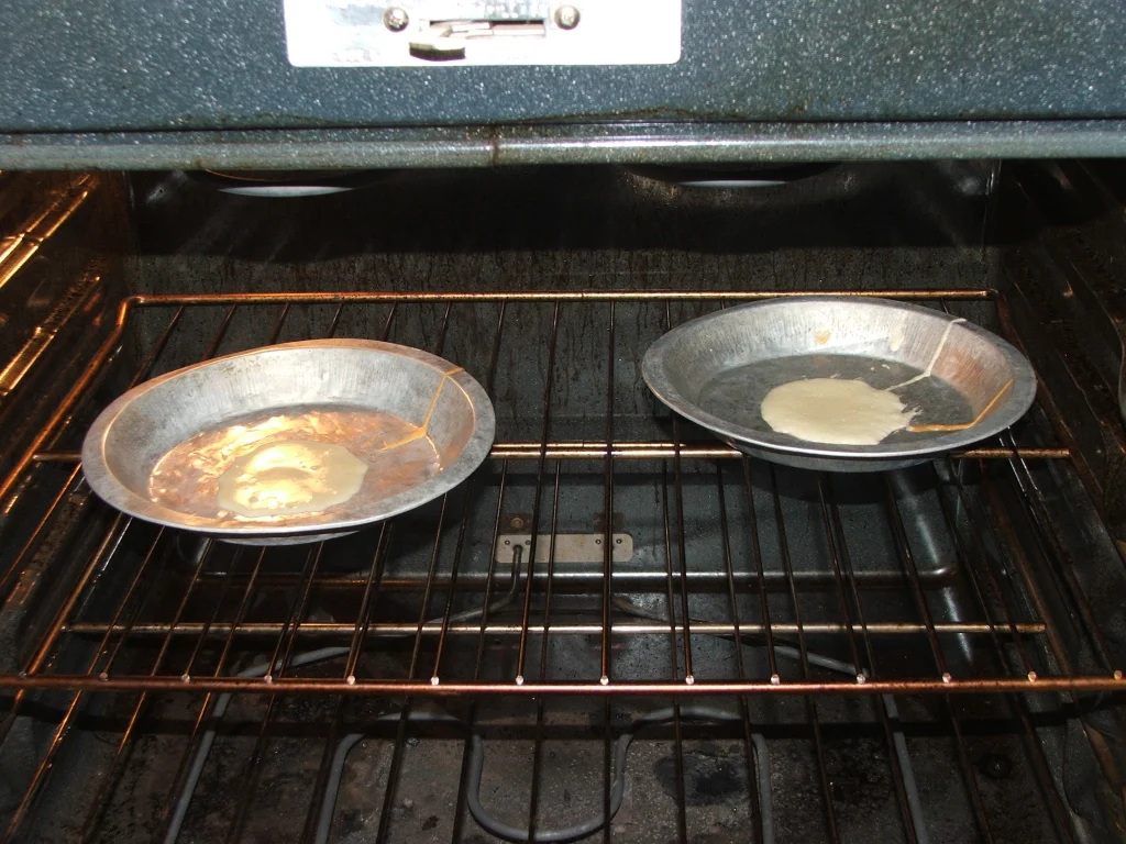 I got two pie pans out, with smooth bottoms, not the bumpy bottom ones. Then I dip out some mix with a tablespoon and I spread around a thin layer of the mix until it’s about 4 inches across. It’s really thin and you will see why in a minute. Once you have that spread out in the pan, put it in the preheated oven of 300 degrees. I forgot to tell you that earlier. 300 degrees.