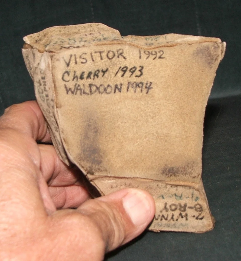 The names were written almost anywhere we had a place to write a name and put a date down. There were some years it didn’t get passed around because the holder of the trophy didn’t realize they had it. In one case Wapiti Dung, Mountain man Extraordinaire, had it on a shelf in his basement and it was there long enough that even the mice would not run past it for fear of sneezing from all the dust.