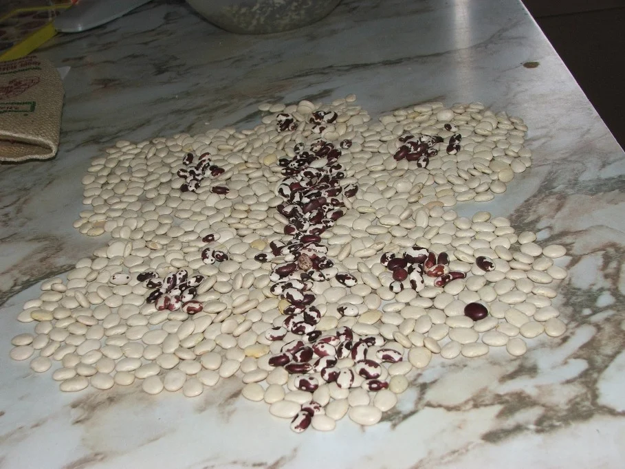 Borrow some baby lima beans, black eyed peas, pinto beans, big lima beans, red beans or Anasazi beans from your neighbor. Or go buy some. Sort through the bag and take out all the rocks and bad stuff you sometimes find in with the beans. Put them in a big bowl and cover them with water to soak over night. Set them aside until tomorrow.