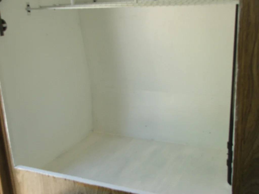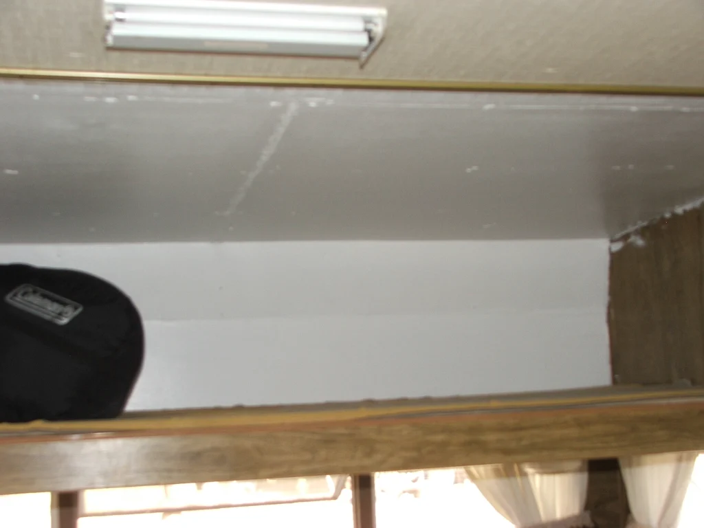 Finally the area at the other end of the trailer needed to have its Frog Mouth fixed.  That meant taking down the overhead bunk first.  That didn’t take long and with some more framing work fixed, up went new paneling and a fresh paint job.  I chose white paint throughout the fix as it will make the place brighter and seem bigger.  Besides, I had almost two gallons of bright white paint in the basement that would just get hard over time.