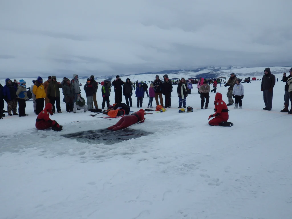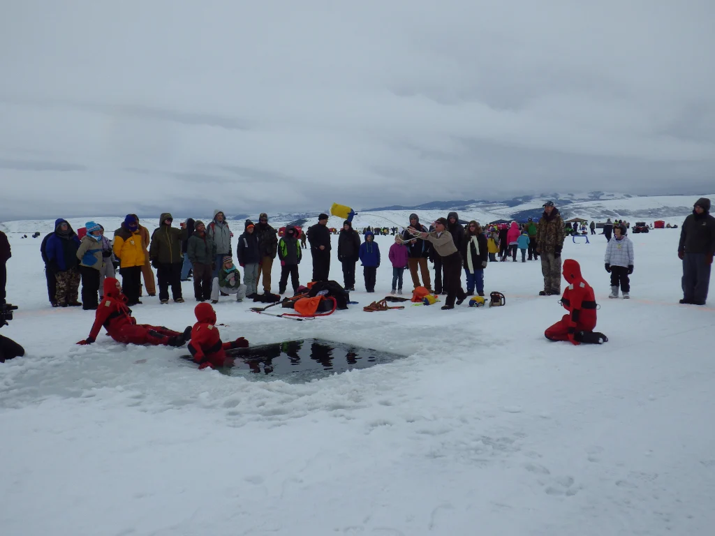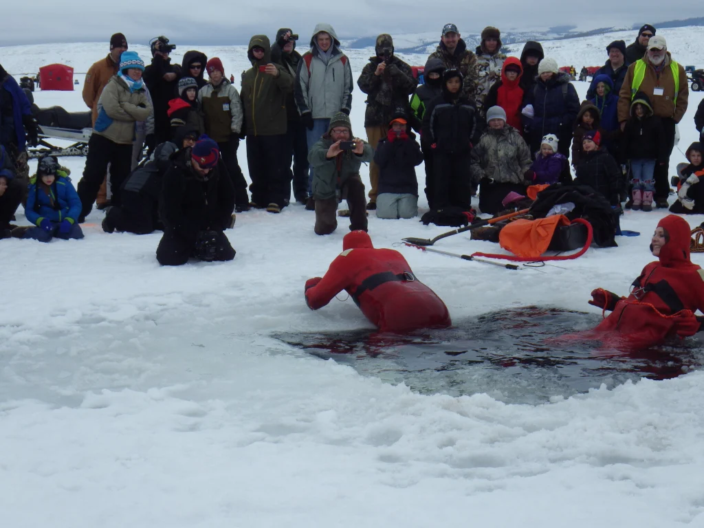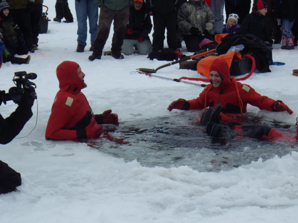 Tanya watches how Adam shows off that technique.  She got to do it as well and it does not look easy.  And, even though these people had floatation suits on, the normal person would not and so that very cold water will soak up your clothing very fast and so not only are you going to be pulling your own body weight out of the water, you will have the added weight of wet clothing to pull out as well.  I think my ice fishing is going to be on very solid 4 plus inches of ice.