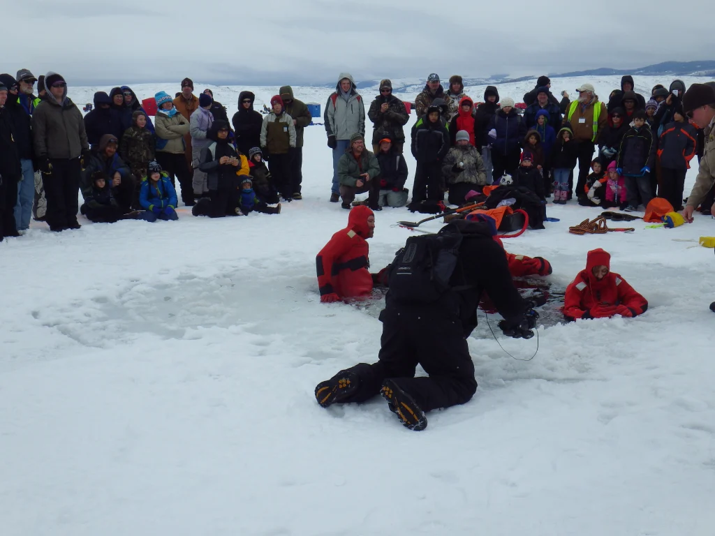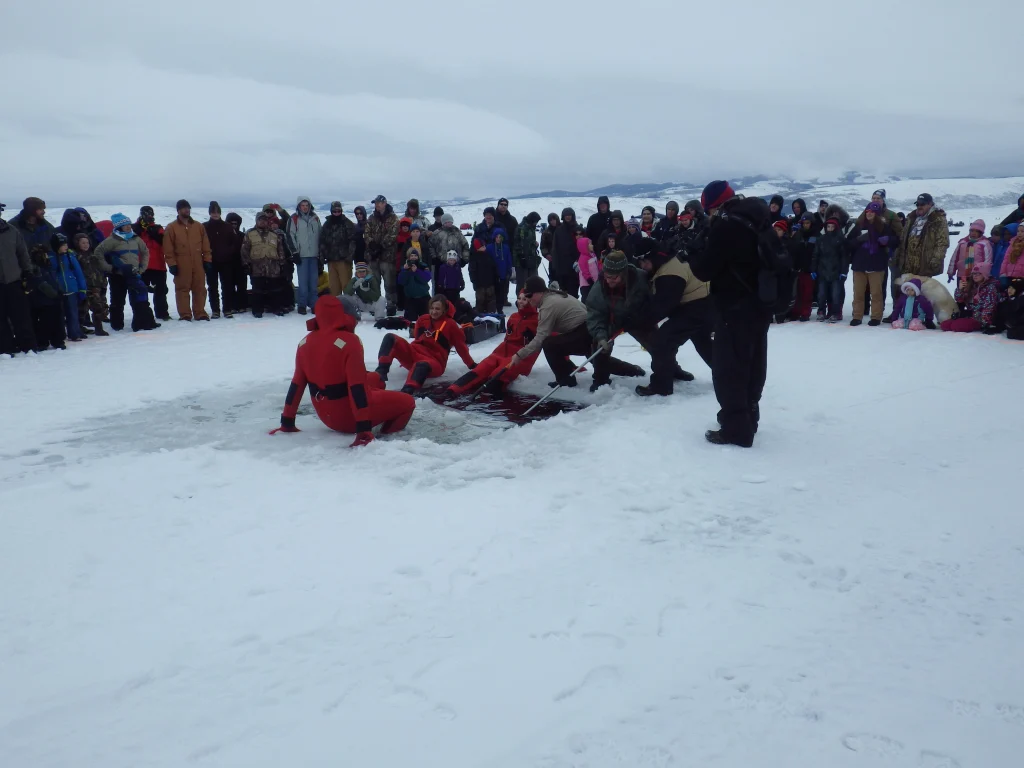 The demonstration went really well for two of the three people in the ice suits.  The one with his back to us is the famous Adam Eakle with the KSL Television Outdoors show, while the two across the ice hole are ladies.
