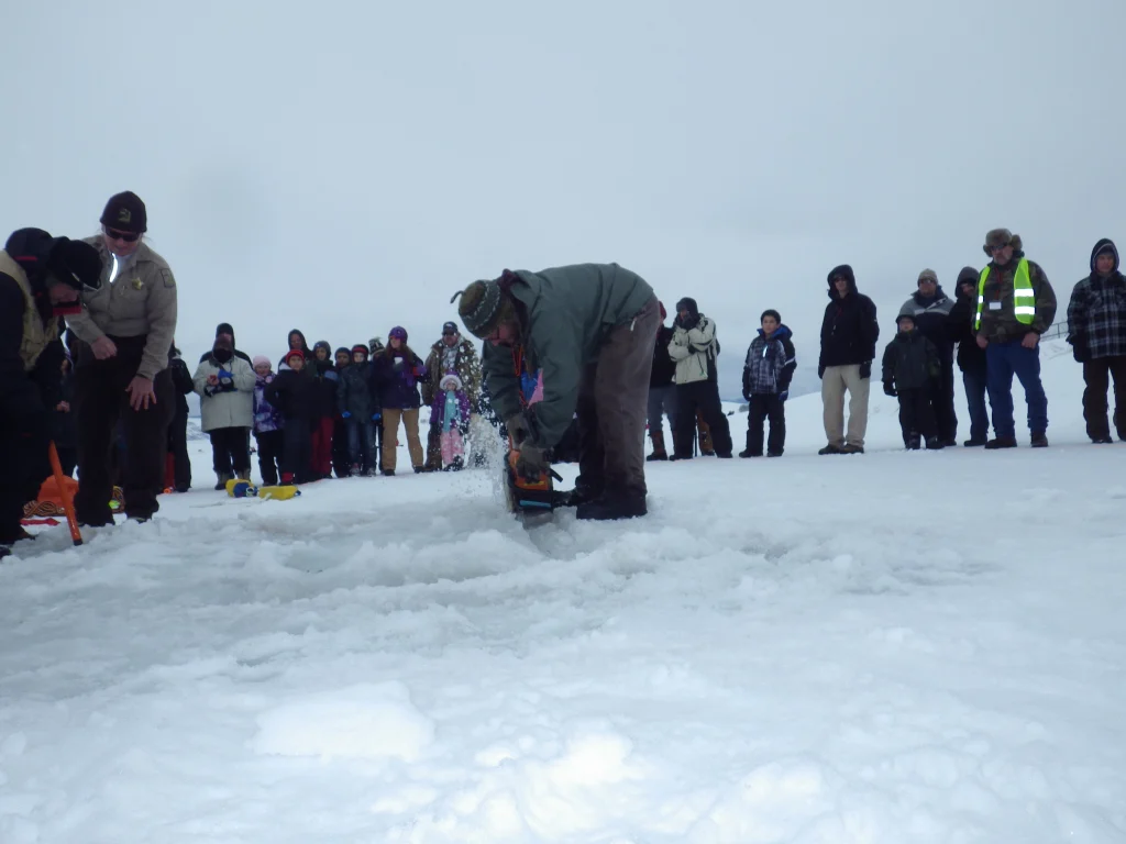 This is Jason, one of the organizers and officers of the United Wildlife Cooperative organization as he is cutting the ice with a chain saw.  The idea is to cut the ice and then push the big chunk of loose ice down and under the shelf of ice that makes up the rest of the lake.  After the demonstration is over, that big chunk of ice is pried back into the hole and allowed to re-freeze.