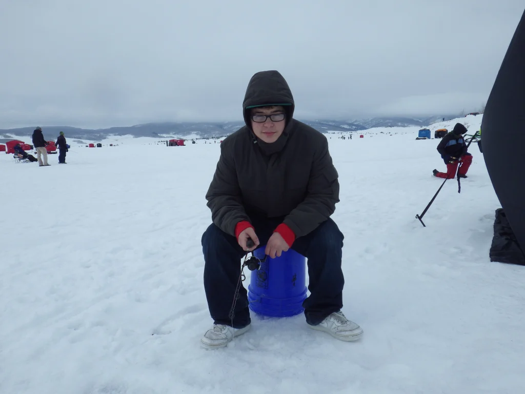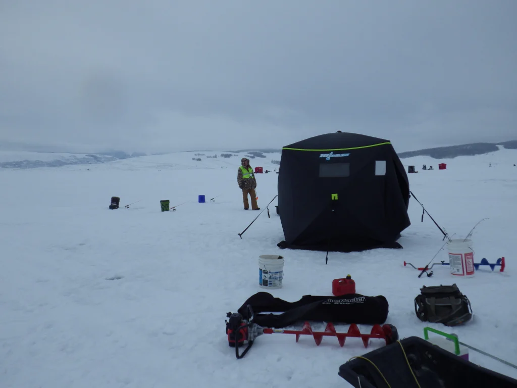 My two guys were a bit older in the group and both had fished before, just not ice fishing.  Neither was dressed too well for the cold breeze that came up and they spent some time inside the warm ice shelter when they just couldn’t stand it any longer.  They were real troopers however, and spent a whole lot more time fishing than they did inside the tent.