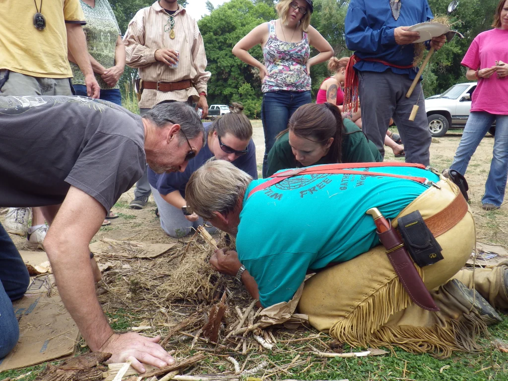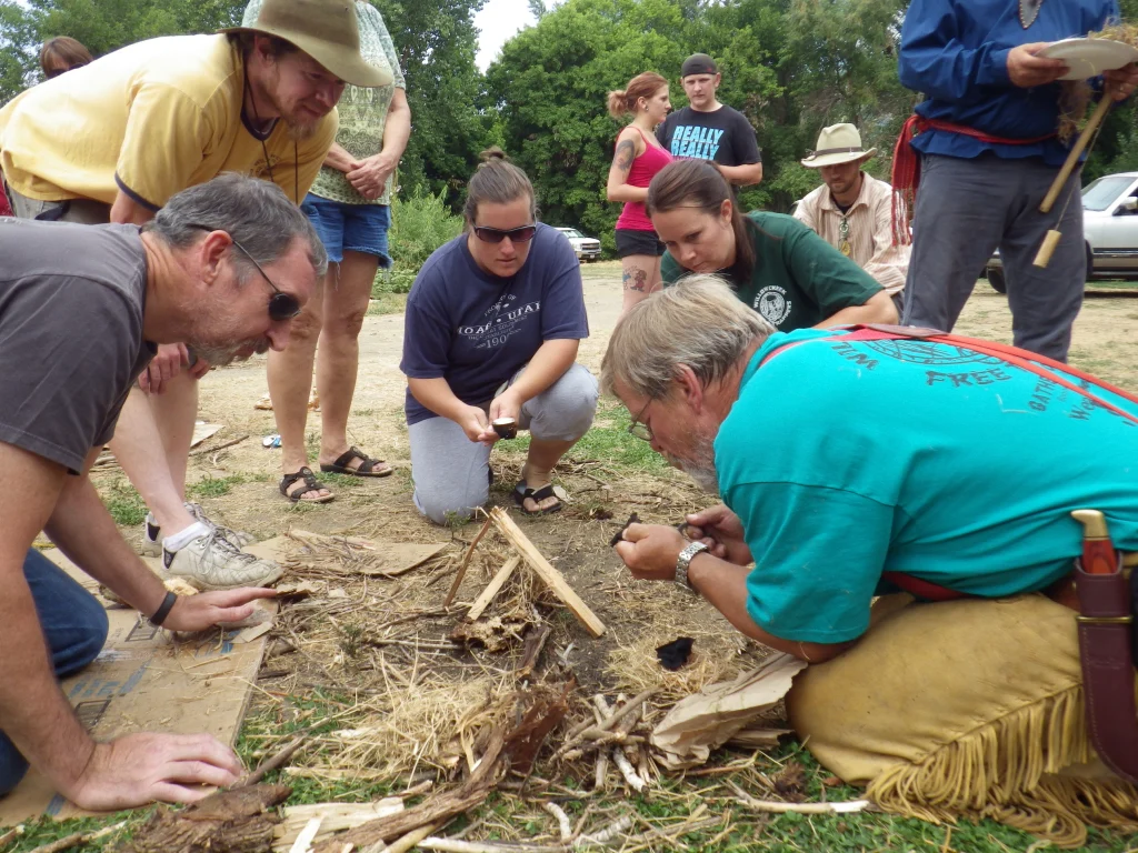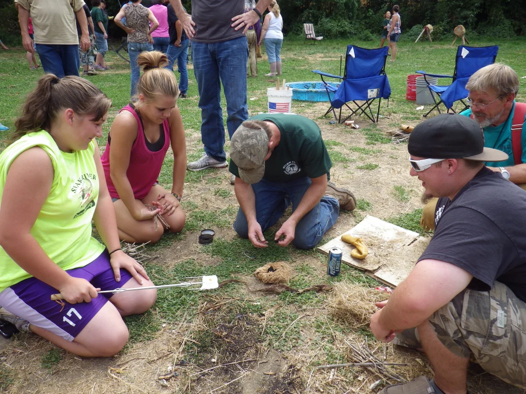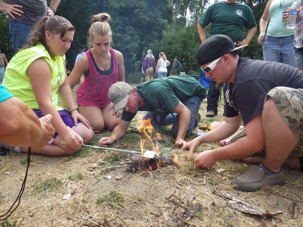Fire Starting: Using primitive means, the team is to start a fire and pop a kernel of pop corn out of a pan. This is a timed event and the only thing given to the teams is a few drops of oil and a couple of kernels of pop corn. The teams have to gather their materials and make do with what they have.