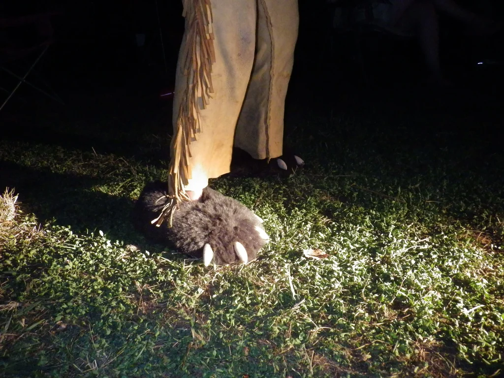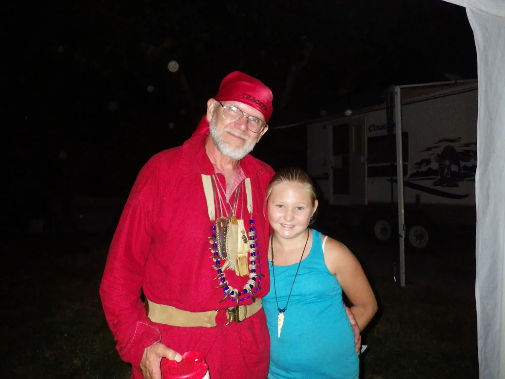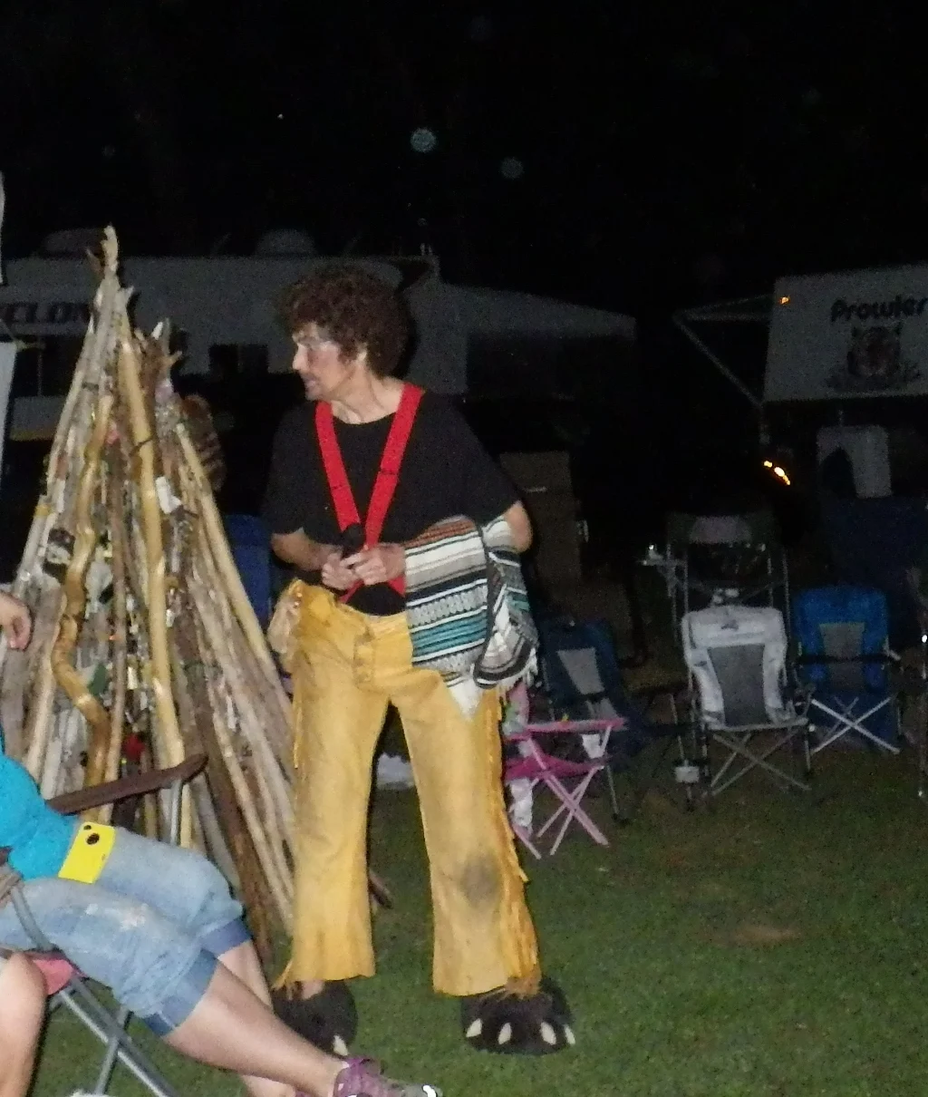 As the time came for the Council fire, Bones had called for an adult flint and steel contest which was politely won by Dry Dog in under one minute! My flint and steel would not cooperate. So with Dry Dog winning he was up against the kids winner “Little Pockets” tomorrow night. And on went the Council fire. All the prizes for the days events were handed to the appropriate winners and then it happened……a surprise visitor from days long ago!