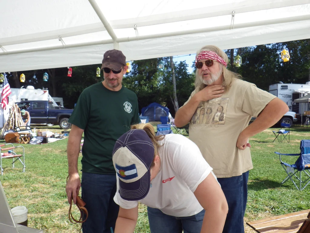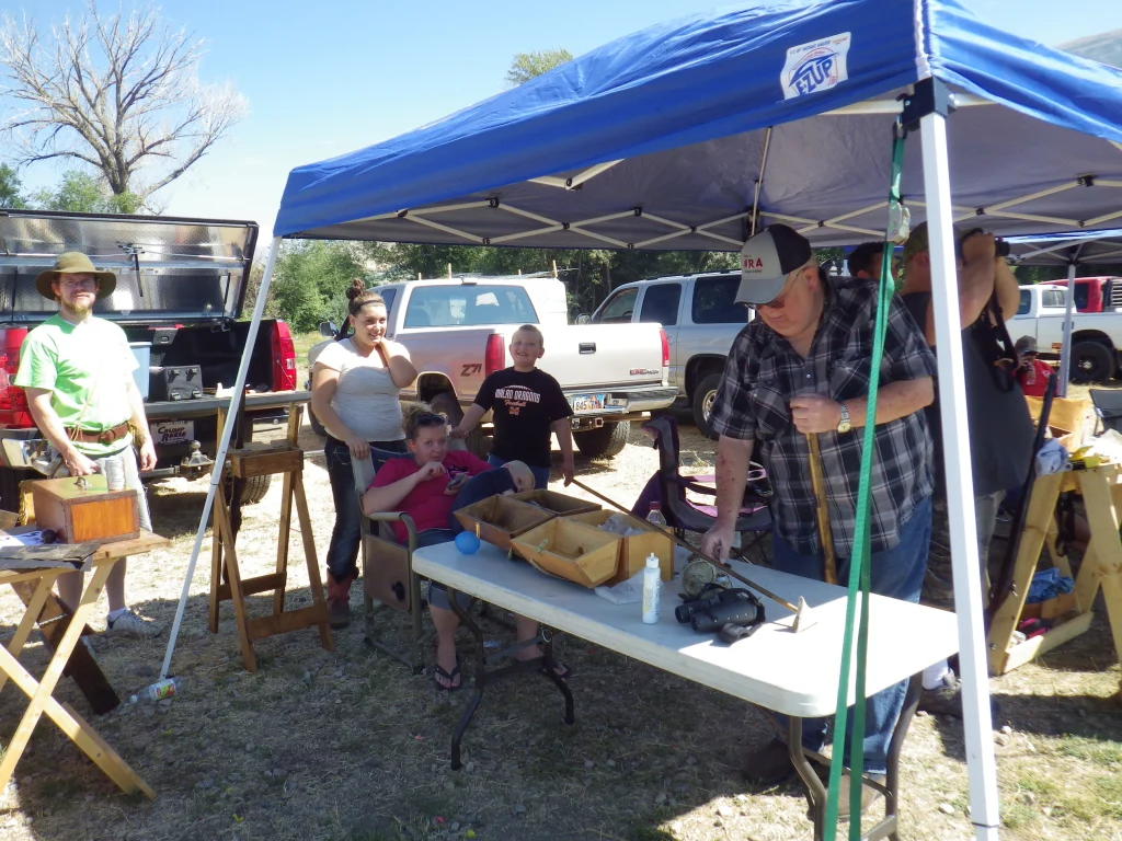 Bones cut me some slack and let me go down and see the BB Gun shoot and there were a lot of kids that wanted to play with that. Switch Back took charge and had the younger kids (under 5) line up to take their turns at a “Nurf Gun” shoot. They dipped the tip of the dart in ink and the kids fired at a target leaving an imprint where the dart hit.