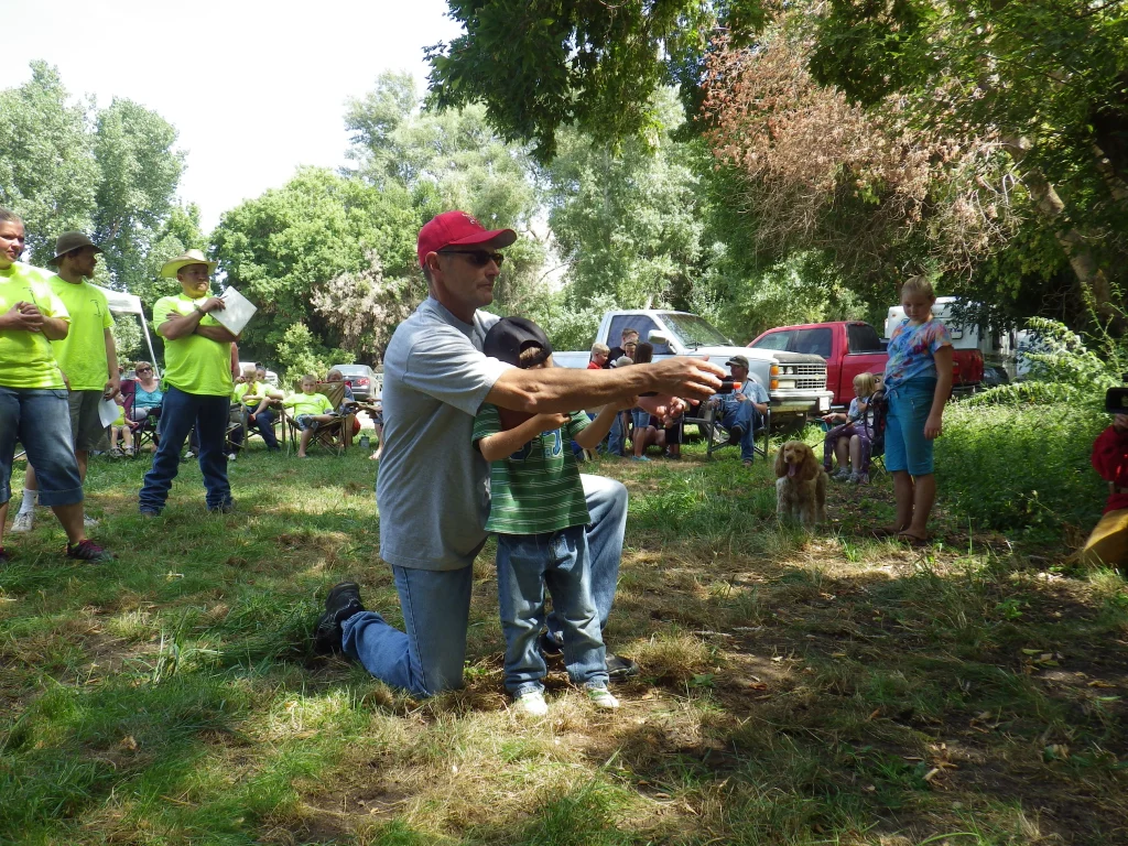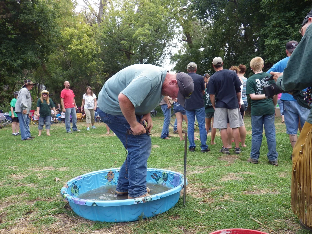 Just like in the Junior limpics, these folks have to throw that sticky old buffalo chip for accuracy. Then over to the limpic sized swimming pool to set a trap. This is a bit different than in the Junior limpics, this only involves two of the team members…one to set the trap, and one to set the trap off.