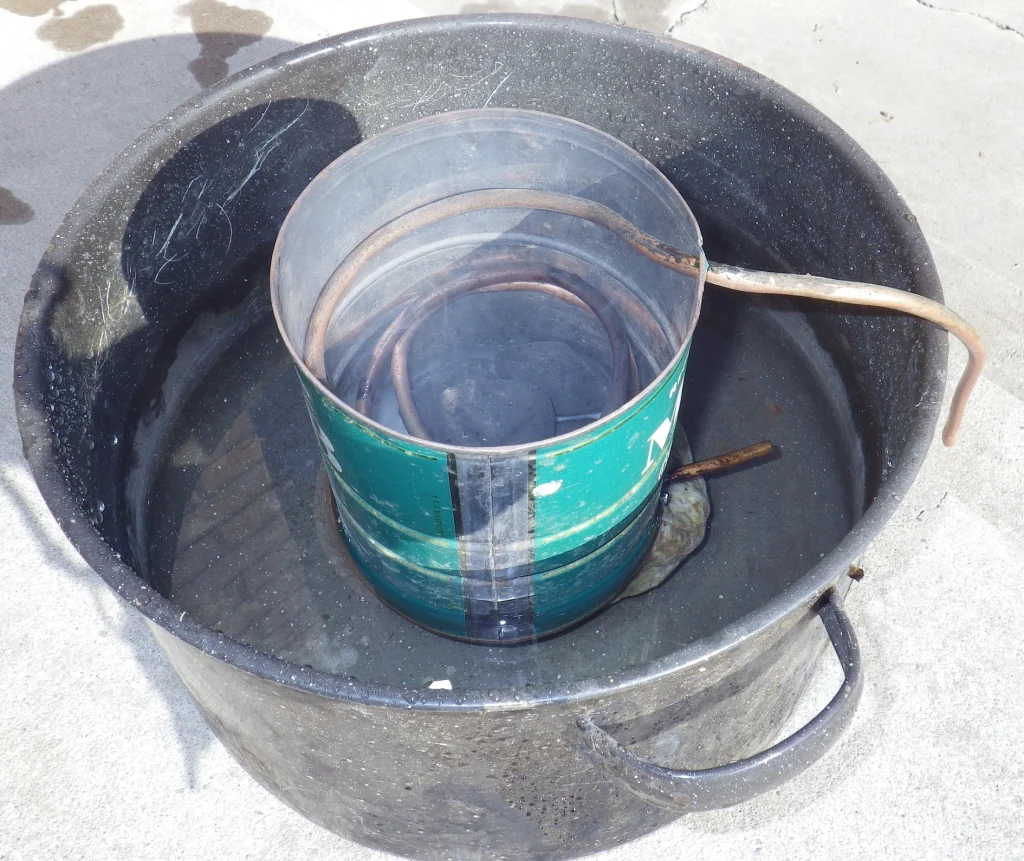 I drilled a hole the size of the copper tubing in the side of the can, very near the bottom, poked the copper tubing through it from the inside out, leaving about 4 inches sticking out and then carefully coiled up the copper tubing inside the can about 4 coils. Draped the rest out over the upper edge of the can almost directly above the pipe coming out the bottom of the can.