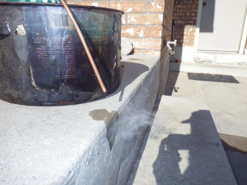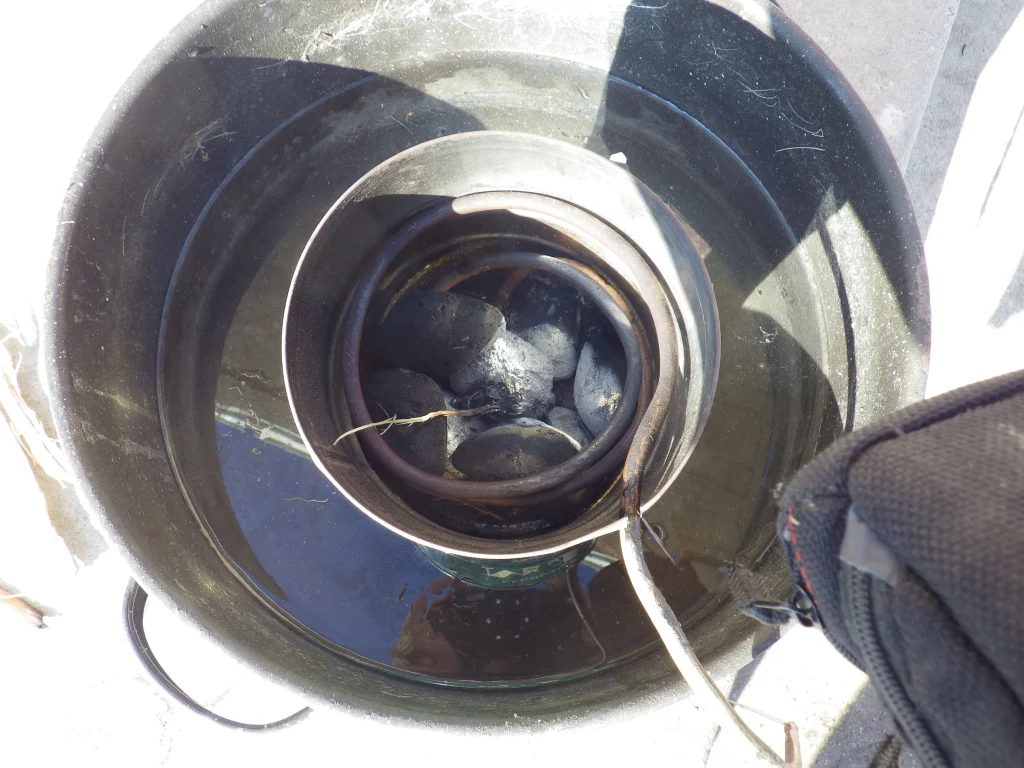 I have an old metal kitchen pot I use to boil animal skulls in and I grabbed that, put a rock in it and then filled it about half way with water. I set the can with coils on top of the rock so the small tube coming out the bottom of the can is under water and the tube extending over the top of the can came out and over the side of the big pan.