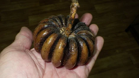 The picture I have shown here is a ripe fruit pod. They are green in color while they grow and when the fruit becomes ripe it turns this brown color. As the color changes, so does the outer skin of the pod change. It begins to dry out and cracks somewhat between the “petals” that you see. Once it reaches its peak of ripeness and dryness the outer pod “explodes”….Yes…EXPLODES! The pods exploding can be heard as if they were 22 shells going off and when this happens the seeds inside are scattered about the area.