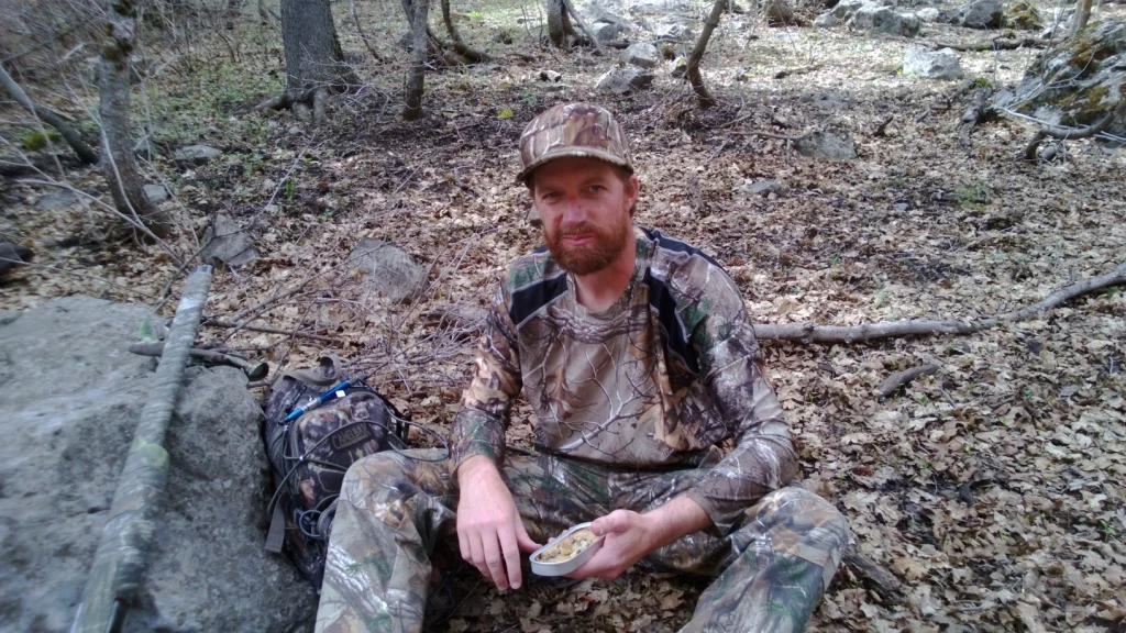 Of course up to the end of the trail we had to take a break and here is Weasel eating some Kippers and Bacon flavored Ritz crackers….Now folks, THAT is a good combination of tastes!