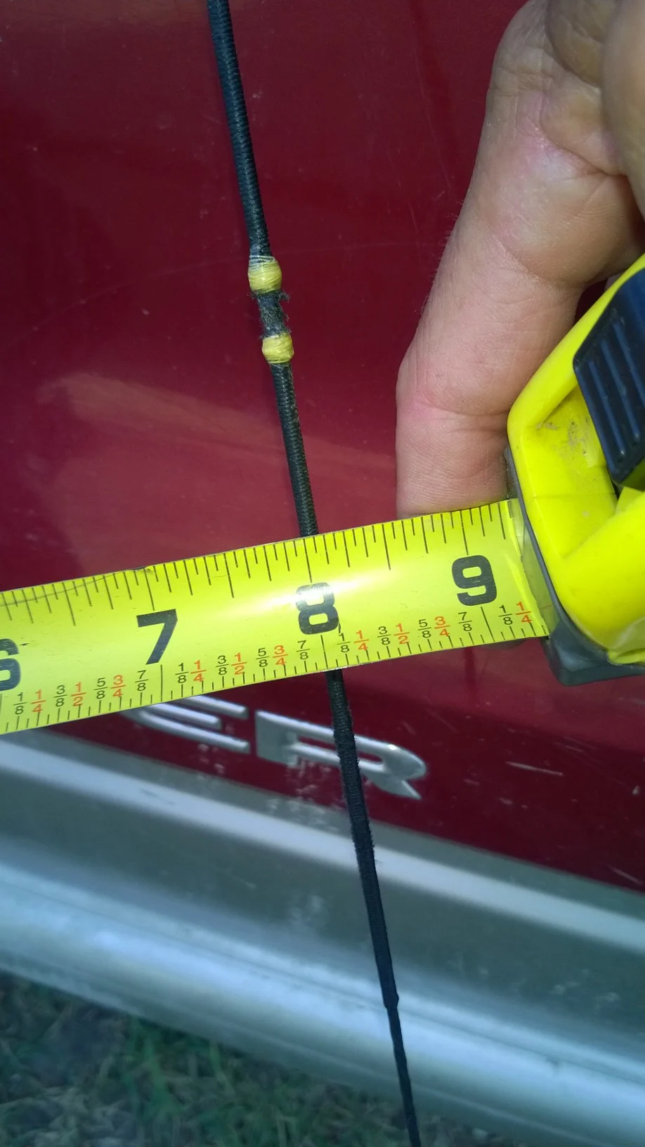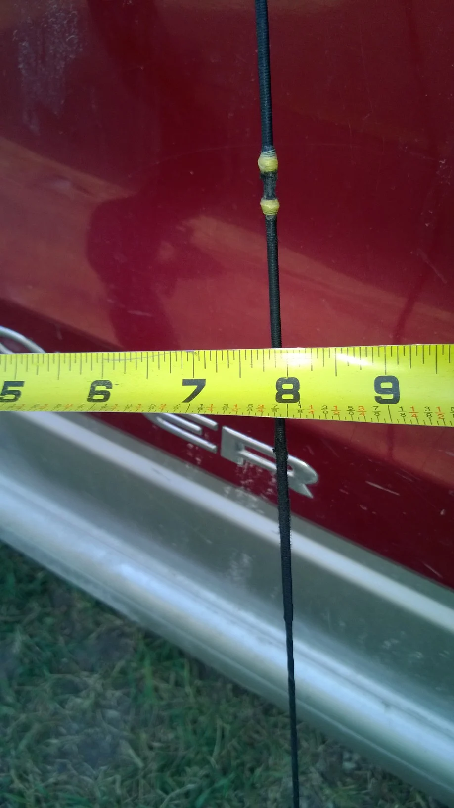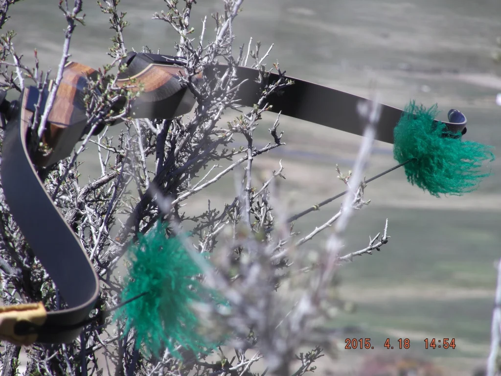 I took 3 to 5 minute breaks after two back to back ends and sat in the shade of the truck. But my thoughts were always on “that other thing” than on archery. And this wild group is proof positive I might as well have been home in the air conditioned house. But, I decided that while shooting this end I had noticed the noise the bow was making had gotten louder. Was it my imagination or had my brace height changed? I pulled out the tape measure and gave it a look.