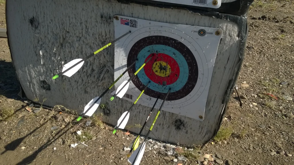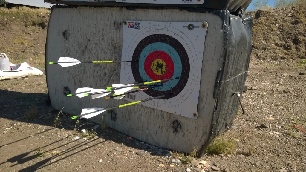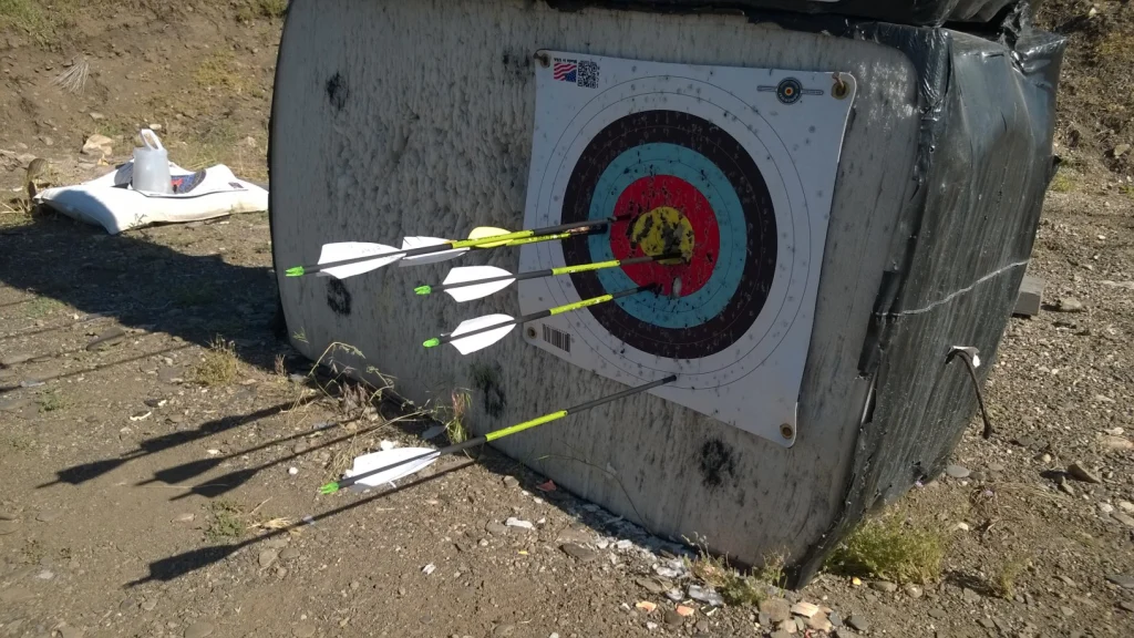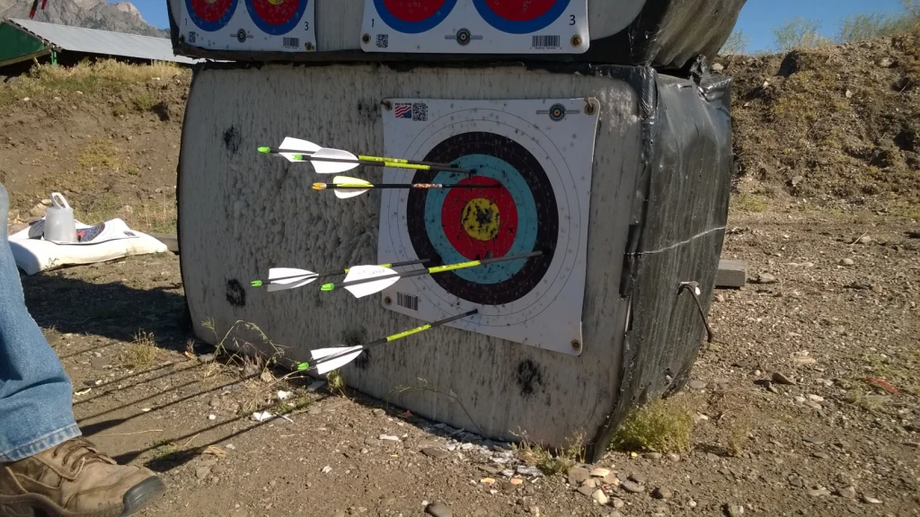 I set up at the 20 yard mark with my usual 8 arrows…you know, the 6 good ones and the two odd balls. Actually they are all good arrows, just the two are those 3050’s that seem to like to go wherever they want to go. I will continue to shoot them just for the muscle work.