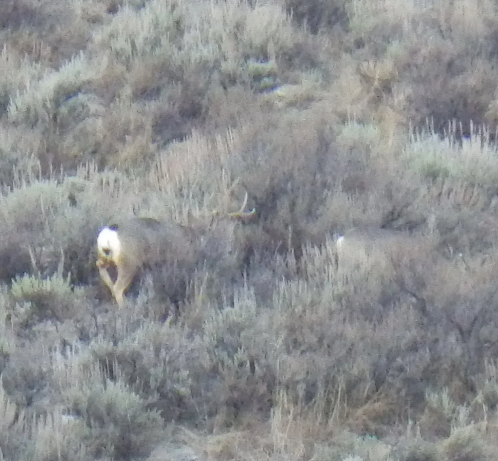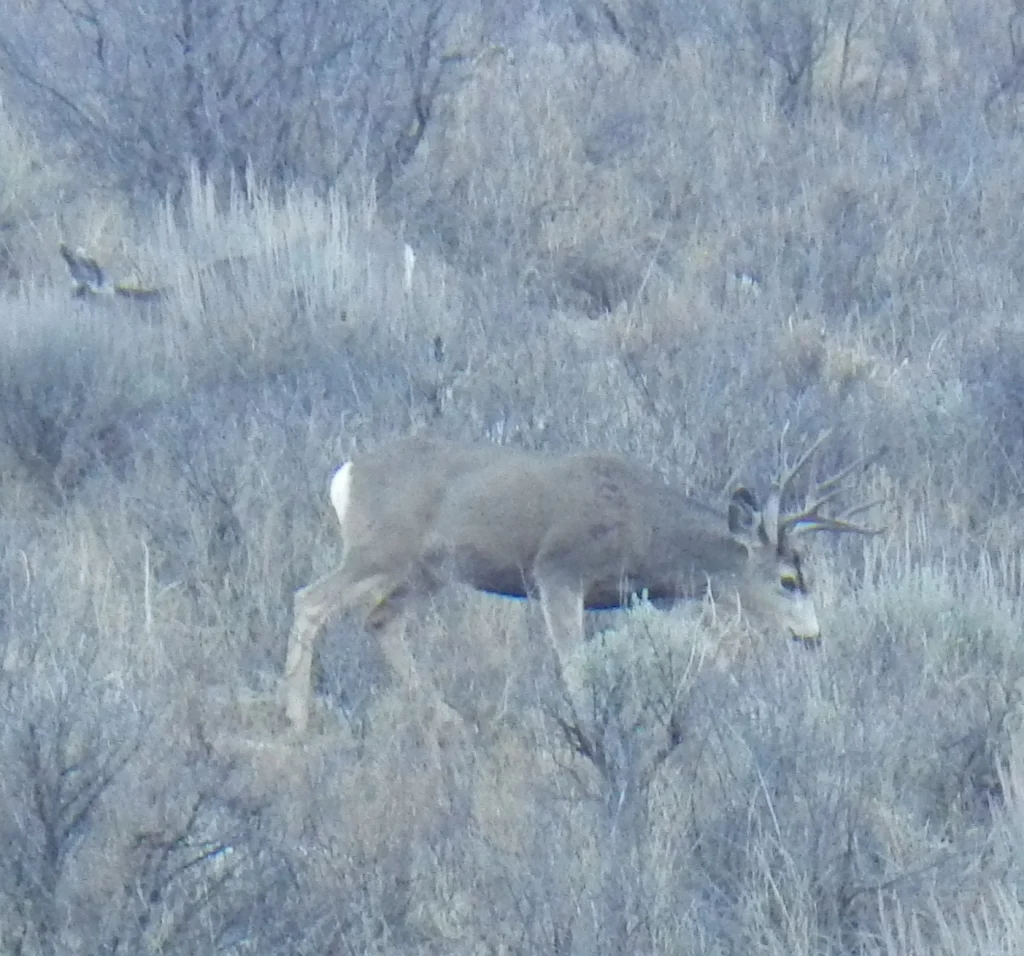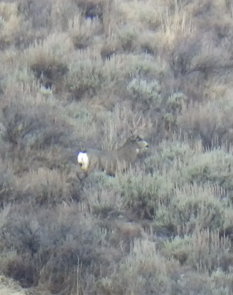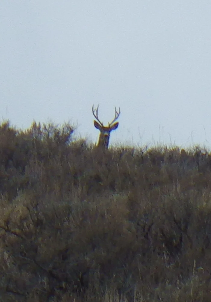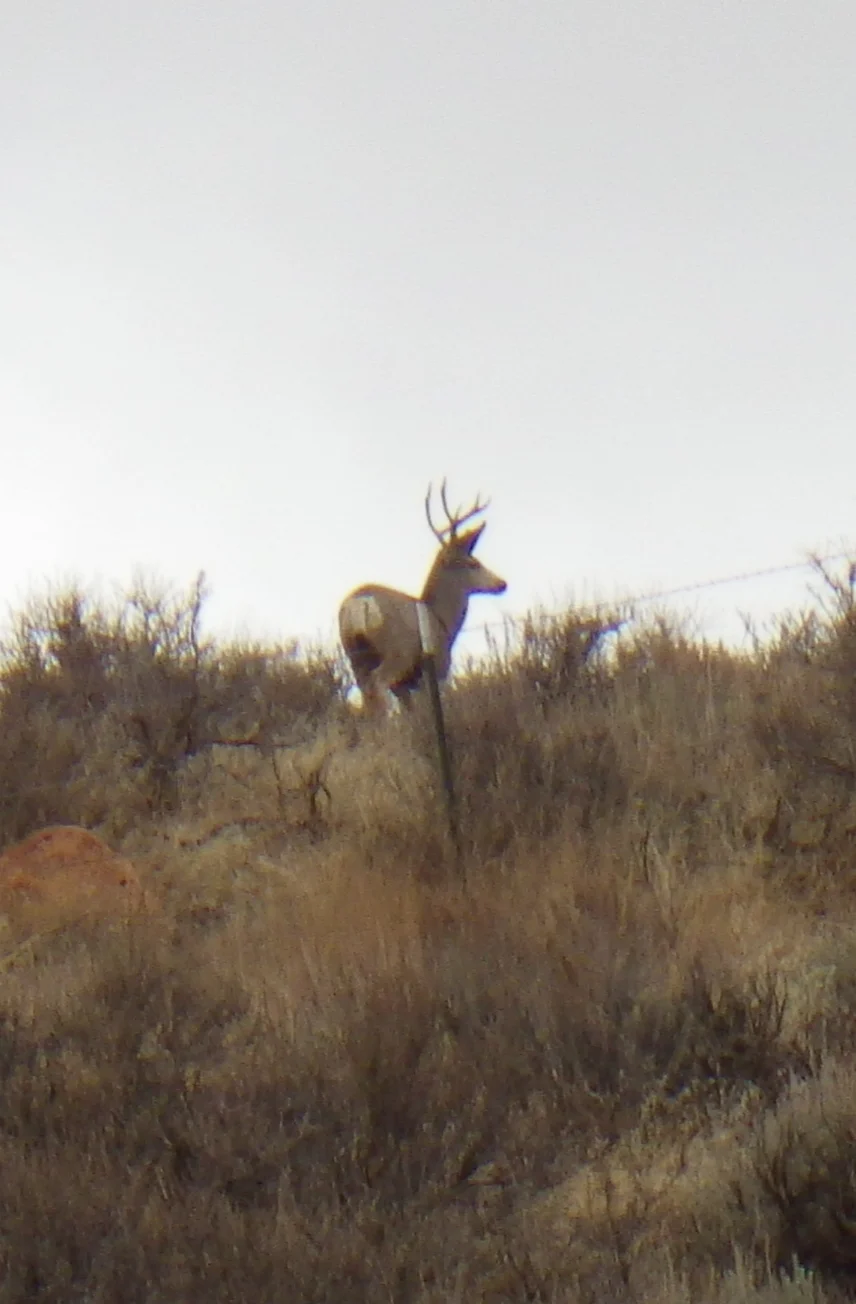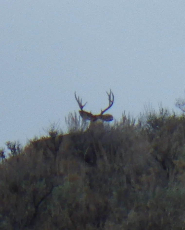 A very tall 3 point. We both thought it strange that the number of deer we were seeing just wasn’t what it was last week. Did they migrate on through? Were they just not near the road? Were they just laying in the tall grass and sage? Whatever the reason the deer just were not as plentiful as we saw last week. None the less, we did see a couple bucks.