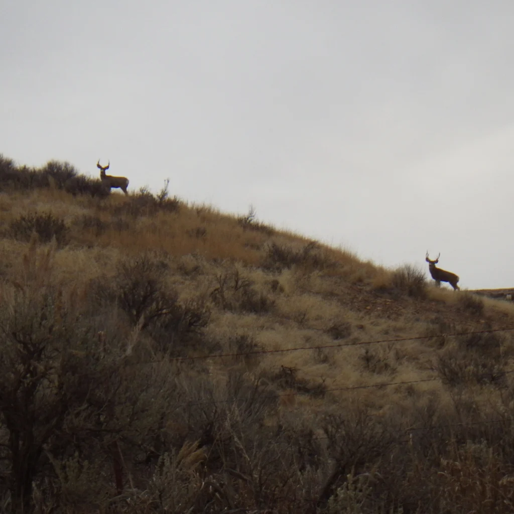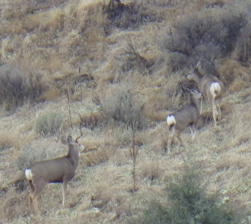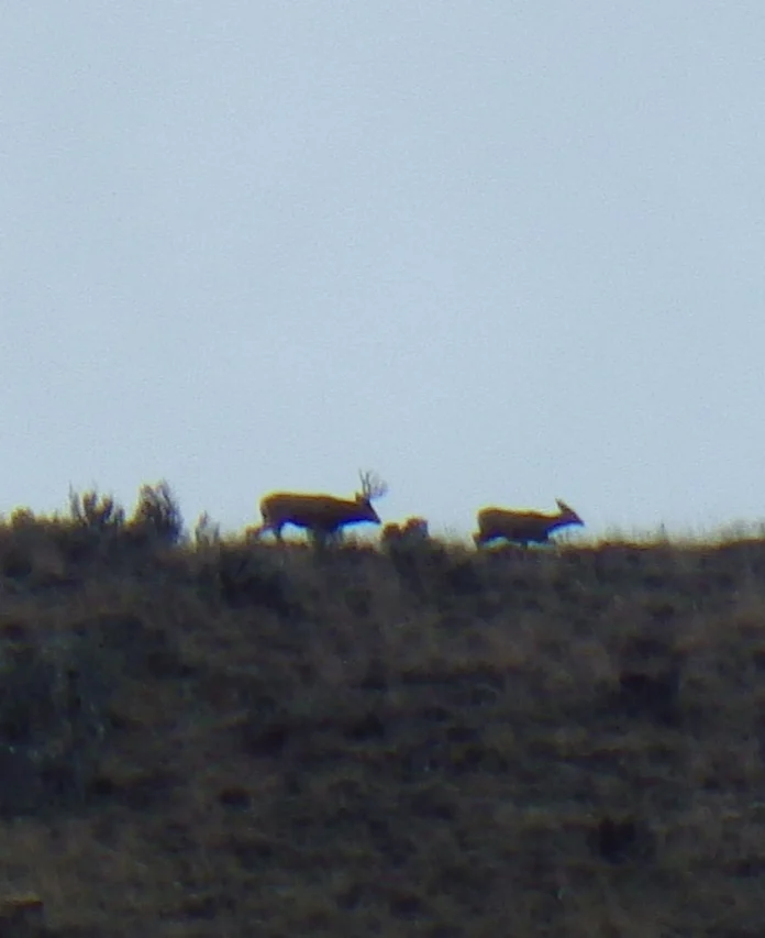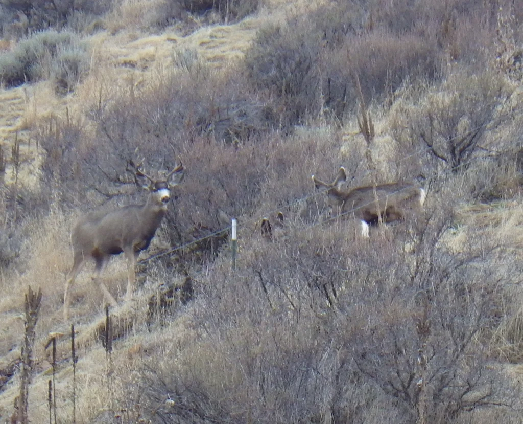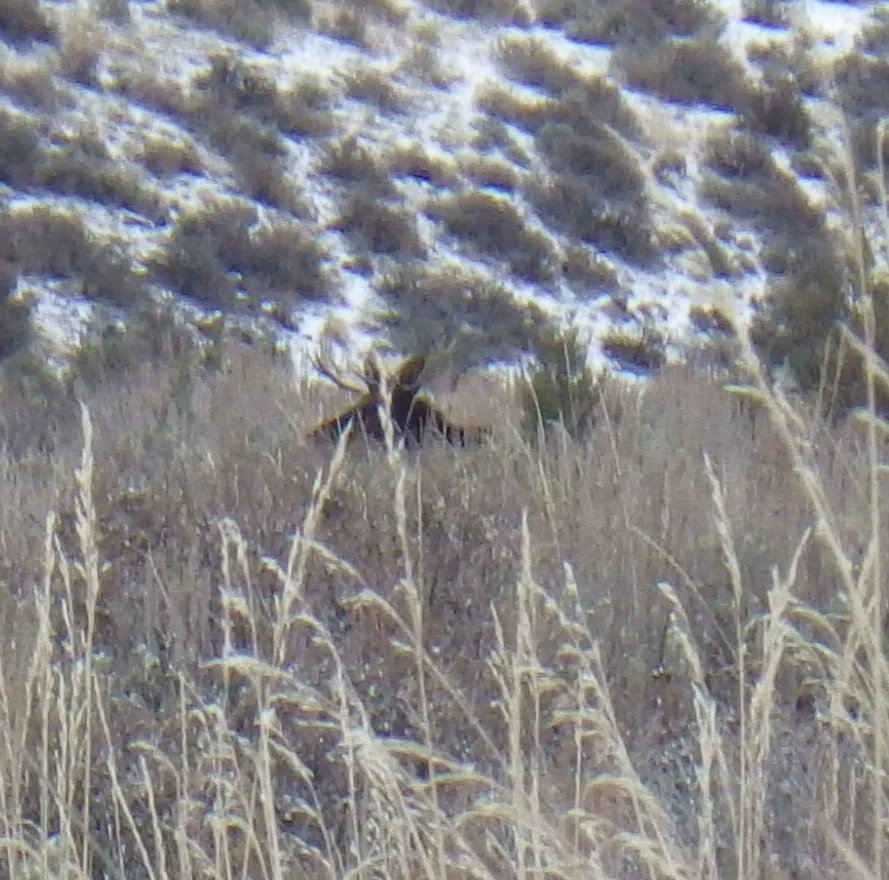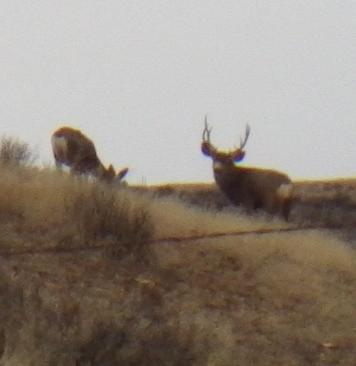 A very tall 3 point. We both thought it strange that the number of deer we were seeing just wasn’t what it was last week. Did they migrate on through? Were they just not near the road? Were they just laying in the tall grass and sage? Whatever the reason the deer just were not as plentiful as we saw last week. None the less, we did see a couple bucks.