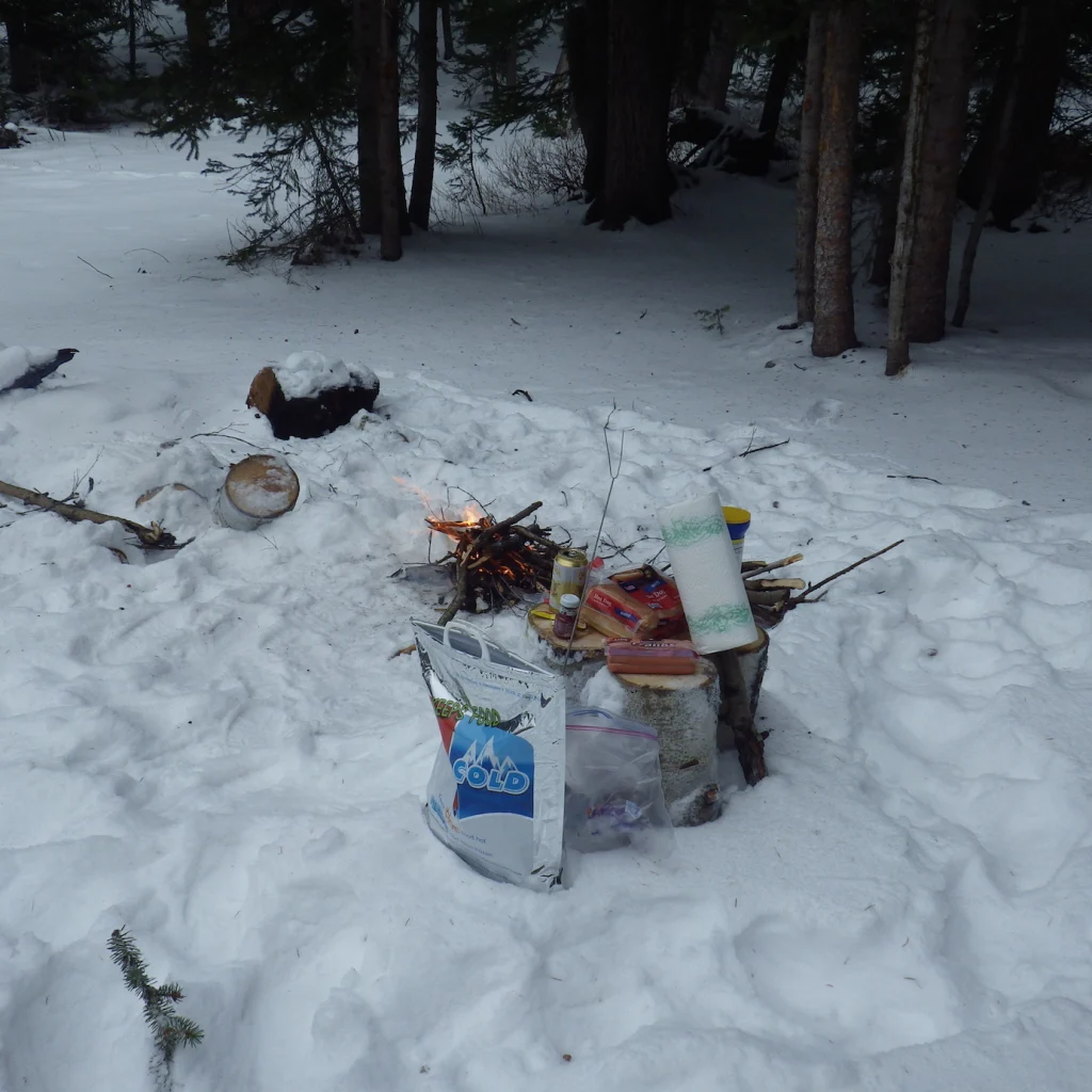 A close look at the scene and you should be able to see we have all the essentials…cold beer, hot dogs, buns, ketchup, mustard, napkins and of course a LONG stick to cook the dogs on. The fire was warm and the snow about 4 inches deep!