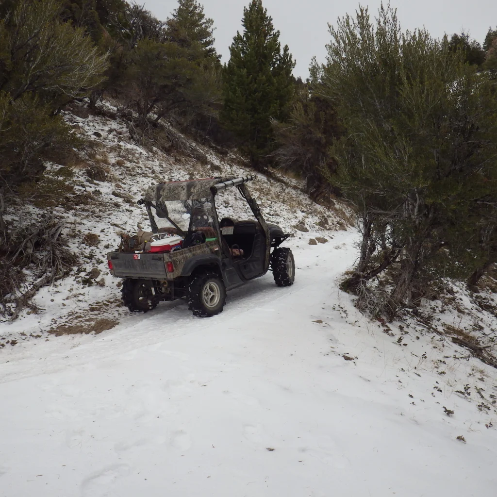 That “road” sure looks more like a trail to me! But we turned to the left and headed up it! A beautiful drive through the snow that was on the ground. Our tracks were the only ones on it. The snow was about 2 inches deep and no problem for the Rhino to traverse it. Never slipped a tire….well….once we got to here. We had a time before we got here and at that time I thought we were done driving up this road. But by unloading about 180 pounds from within the Rhino (Tracker getting out), it climbed right up that slick steep hill! Thanks Tracker for sacrificing and walking up that hill!
