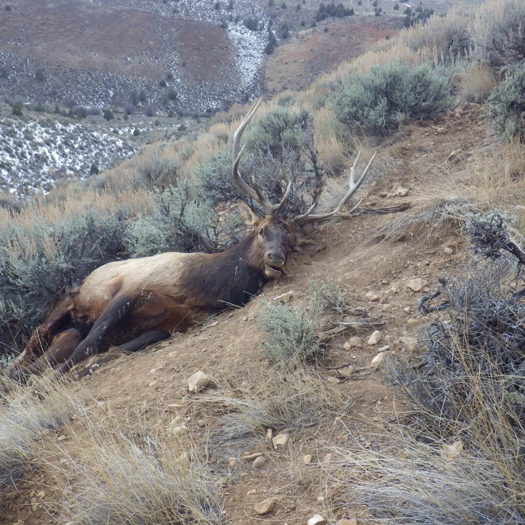 Well, here we are heading up a rocky stretch of the road and going slow so as not to miss the glint of an antler in the high sage. I glanced to my left and saw a lone magpie fly off a branch on the hillside some 400 yards away. I made a mental note of the bird but thought nothing more about it, when suddenly another magpie took flight and then I saw what I thought was the tip of an antler. And then another. I pulled over and glassed what turned out to be a dead bull elk. We made the walk down the draw and up the other side to where the bull lay.