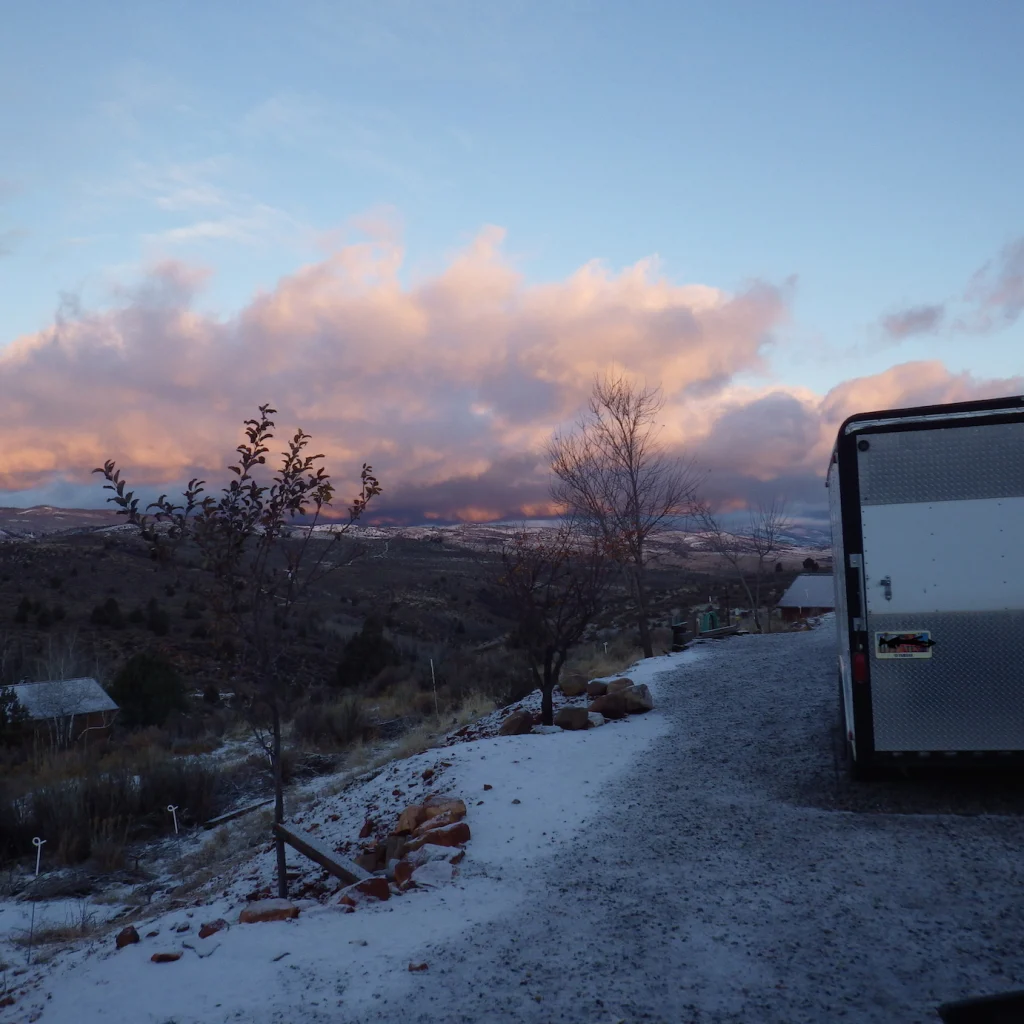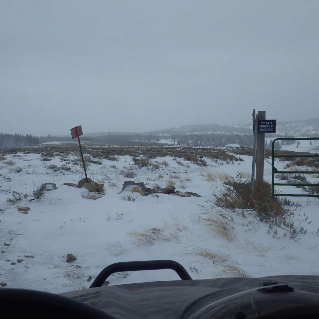 The sign says Private property, but the road went around the gate. We figure this road is probably a pass through road that people are allowed to travel to get from one side of the private property to the other. I don’t know for sure, but we turned around because of the snow that was bearing down on us. The wind was whipping up pretty good too and that made for a very cool ride back down. I was SO glad I had brought ALL my warm clothes…back to the old saying….better to have it!