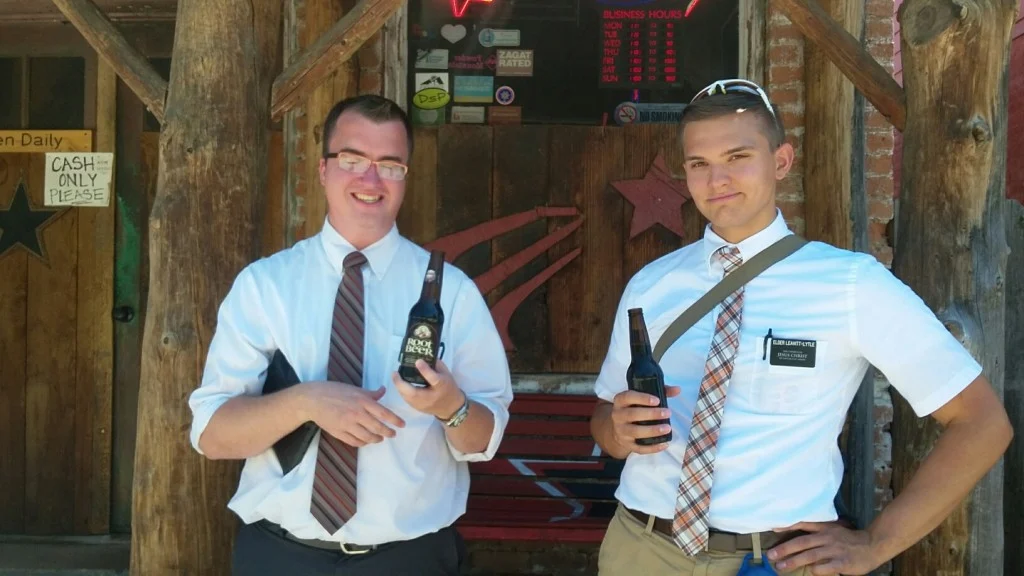 Nothing says missionaries than a couple of them standing outside a saloon drinking beer (root beer). A couple of really nice guys.