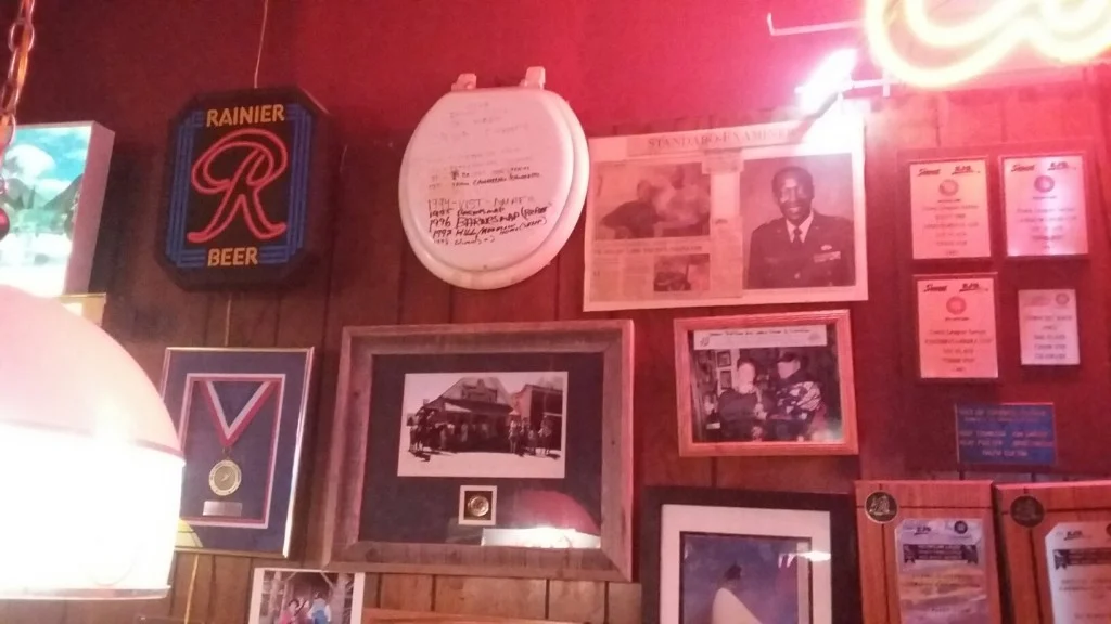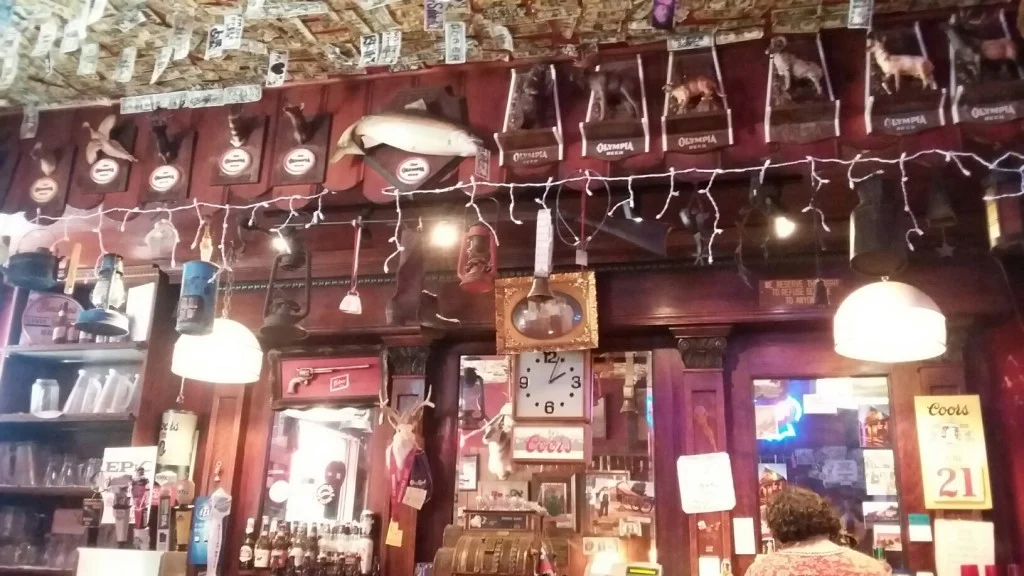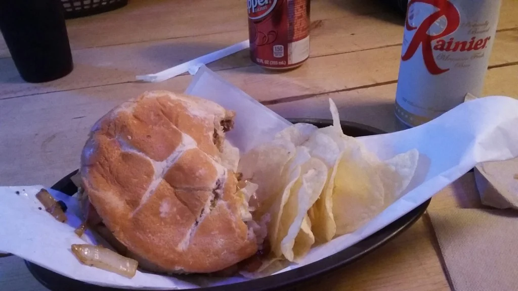 Above the bar is a huge collection of animal plaques from the olden days of Olympia Beer company. When the owner came over to take our order, I said to her, “Now the answer to the question I’m about to ask is ‘YES’….and then I asked her if they had Oly Beer for sale………unfortunately she said no….But then piped up with a cheery…”We do have Rainier….You know…Raineeeerrrrrrrr Beeeeerrrrrrr!!!! (To say that you have to sound like a motor cycle revving up, speeding off and shifting gears) I repeated it with her and then ordered one!