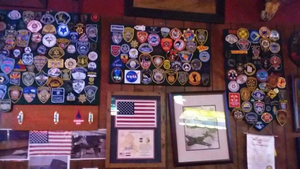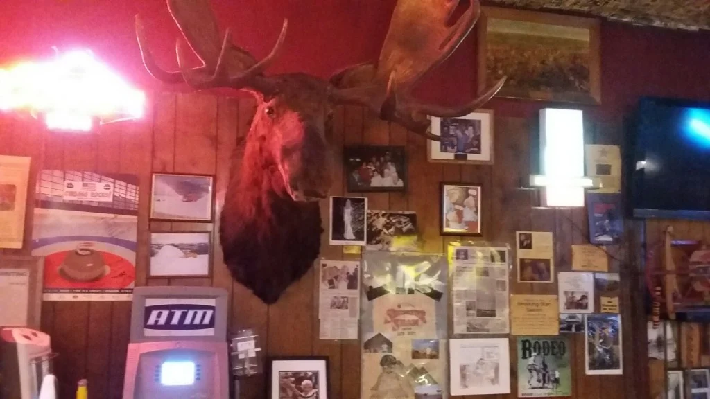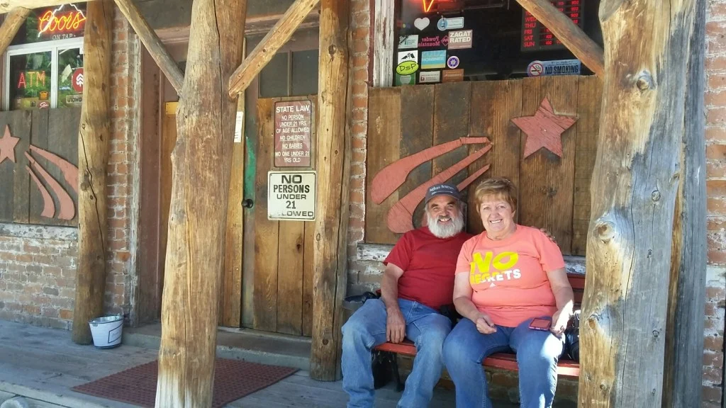 The outside of the place is very quaint…rustic logs adorn the outside and hold up the overhead roof. The doors into the place look like they could be right out of the old west, but they have put handles on them so they don’t swing both ways, but they could be modified easily. I don’t think the owners want to do that however as they don’t stay open all night. Sitting on the front bench I felt like I could be watching a gunfight out in the street in front of the place, but what I saw was two LDS missionaries walking our way.