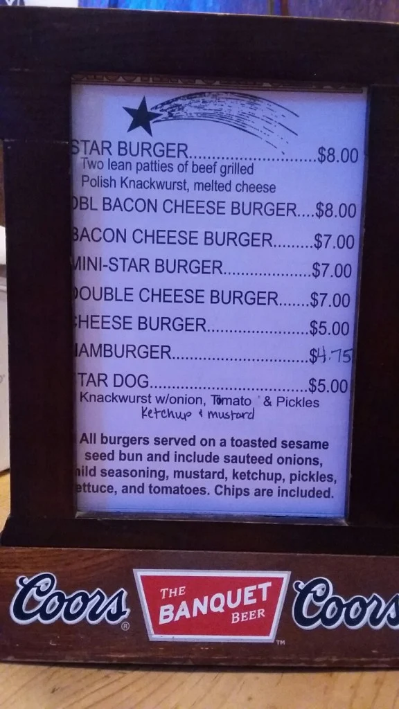 Sherry and I ordered the “Mini-Star Burger”, on the suggestion of the owner Leslie and I’m glad we did because it was actually more than we should have eaten. The Star Burger, as I understand it, is a double cheese burger with a polish knockwurst covered with sautéed unions and all the other fixins. The mini that we ordered had all that but was only one burger.