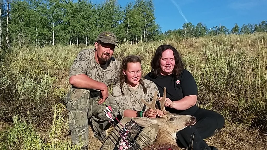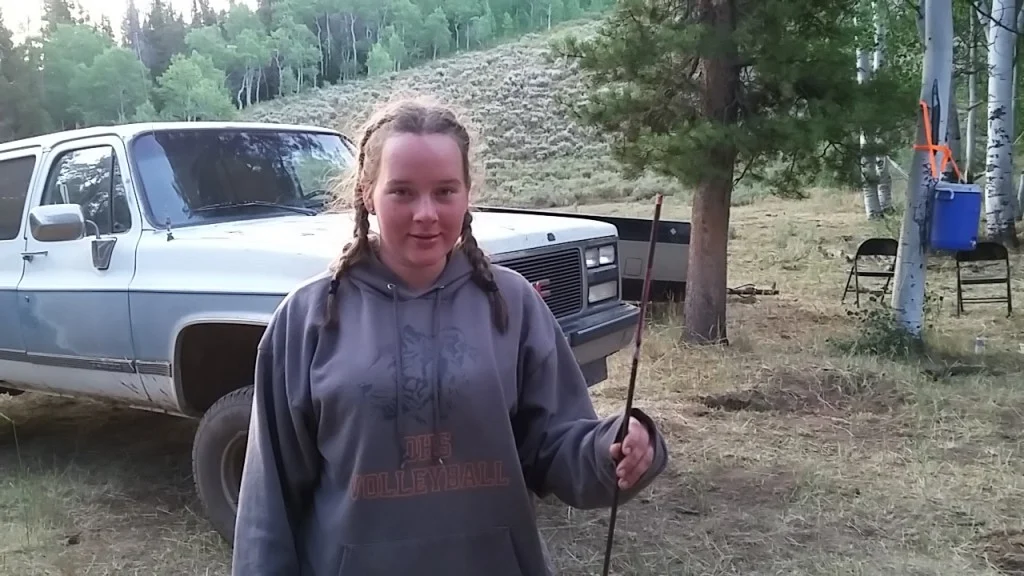 One evening while sitting in camp thinking about going to bed, a vehicle pulled into camp. We had offered to help a family camped down the road should they need it. They were calling us on our word. The young gal (14 years old I think) named Charlott had hit a buck right at dark. They found the broken off arrow covered in blood.