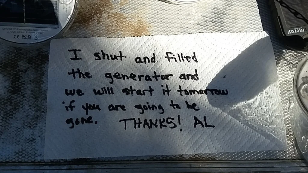 Until the pump quit working I think we saved them 15 or more gallons of gas and at least 10 hours of drive time up and down the mountain. Not much in the whole scheme of things but a little relief for Al who seemed to be the guy in charge. On Wednesday morning when we got back to camp we found this note: