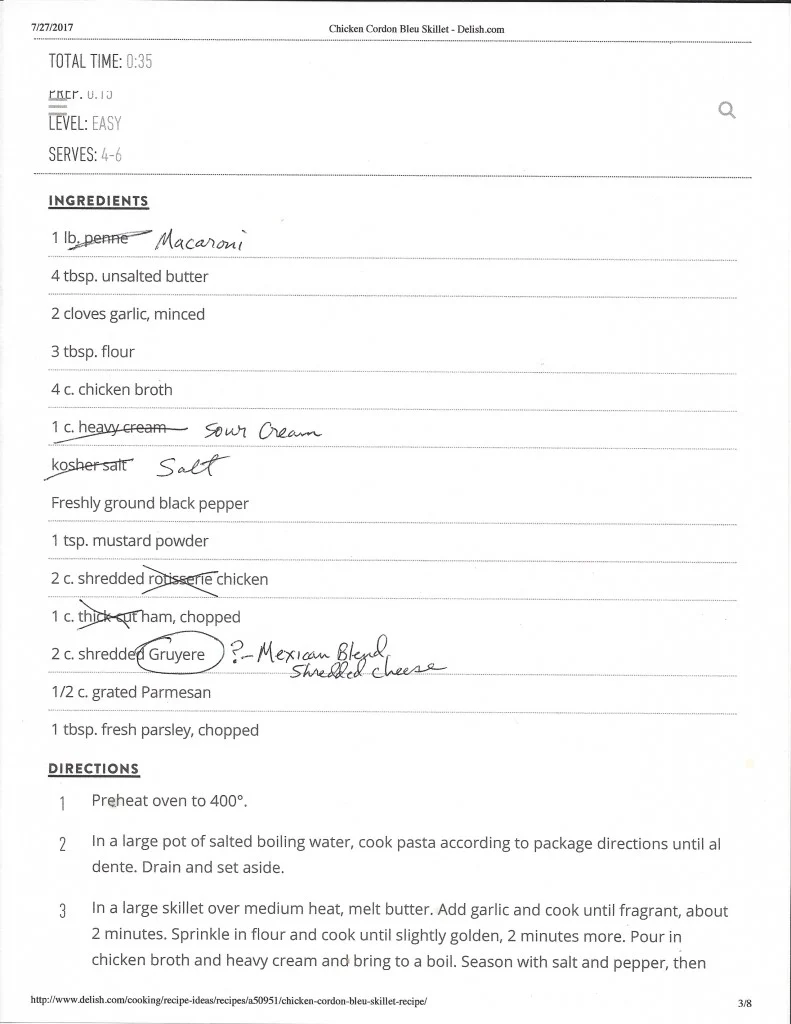 Later on when we sat down to eat, I wasn’t real sure what the outcome was going to be, but it smelled good and unlike my failed attempt at “if it’s good by itself, it must be good mixed with other stuff that is good by itself…vienna kipper pie”, it actually tasted good. Not exactly like Chicken Cordon Bleu, but it did have a hint of that flavor. I’ll be making that again. So, aside from not putting in the amounts the recipe called for and for not putting in exactly what the recipe called for I modified it to the Bears Butt version and I hope some day you too will try it. When you do, keep in mind a cup of something is quite a bit and unless you like a ton of leftovers, you decide if you should really follow the recipe to a “T” or not. Here is what I ended up with as MY recipe: