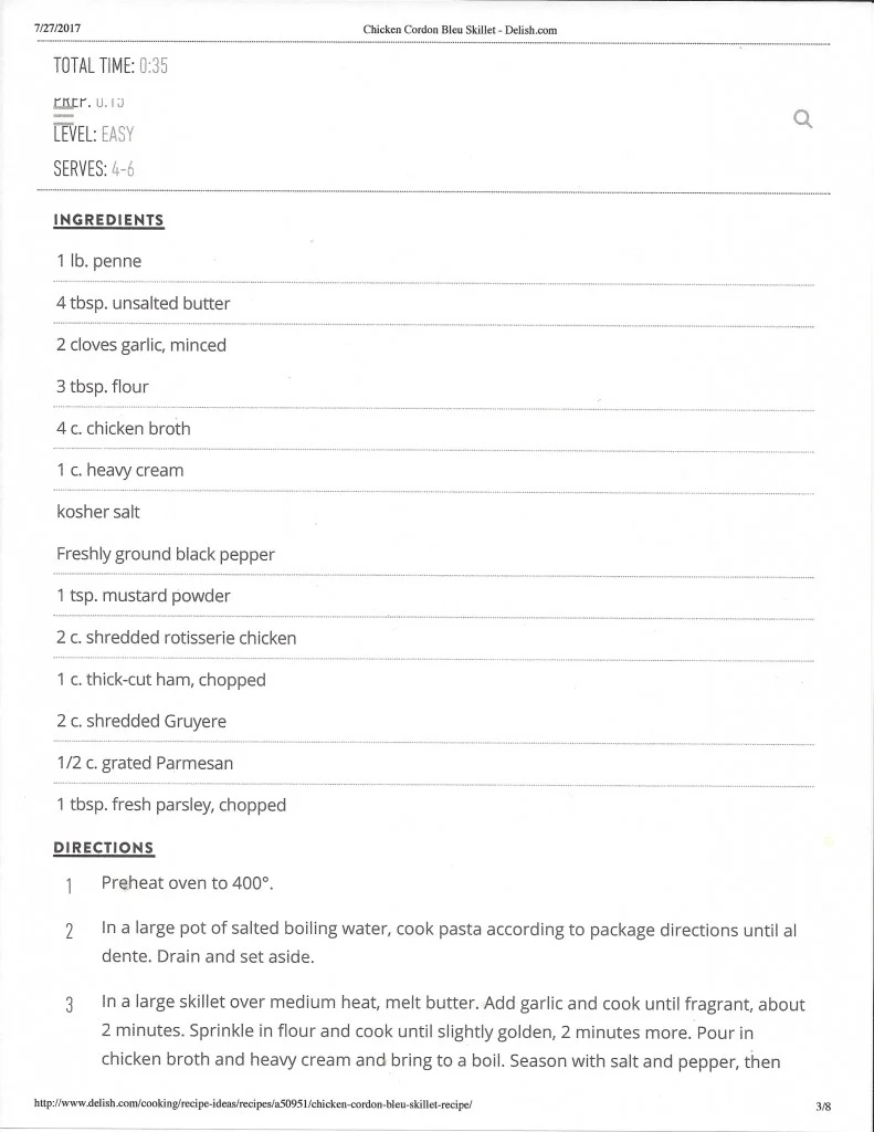 I went to the all knowledgable world wide web and queried, “chicken recipes”. Up popped one called “Skillet, Chicken Cordon Bleu”. Well, I quickly read down through the instructions and the list of ingredients needed. Some were easy to decide if I had it in the house or not, while others were…well, What the Hell is that…!!!! It sounded great and so that was what I was going to put together.