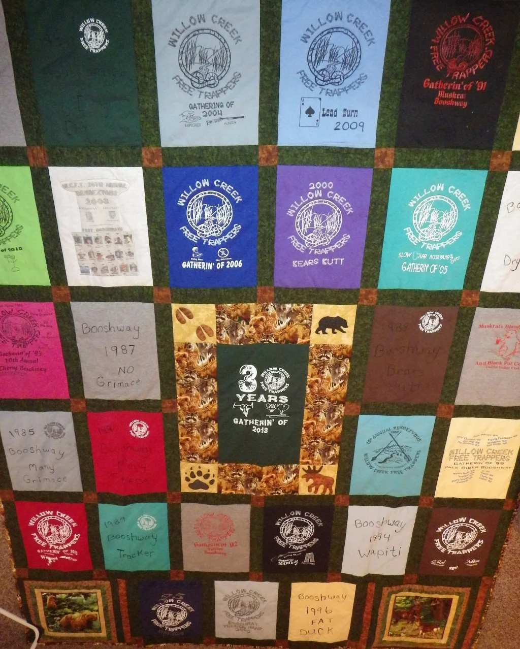 This picture does not do the blanket justice, but you get the drift of what this thing looks like and I want to win it very badly! What JoAnn did where there wasn’t a rendezvous shirt for that year, she wrote on a blank shirt who was the Booshway and what year, so all 30 years is accounted for! The blanket is the size of a King Size bed and she also made two matching pillow cases for it! They match the pattern that surrounds the 30 years center patch. The back of the blanket is made of this same pattern.