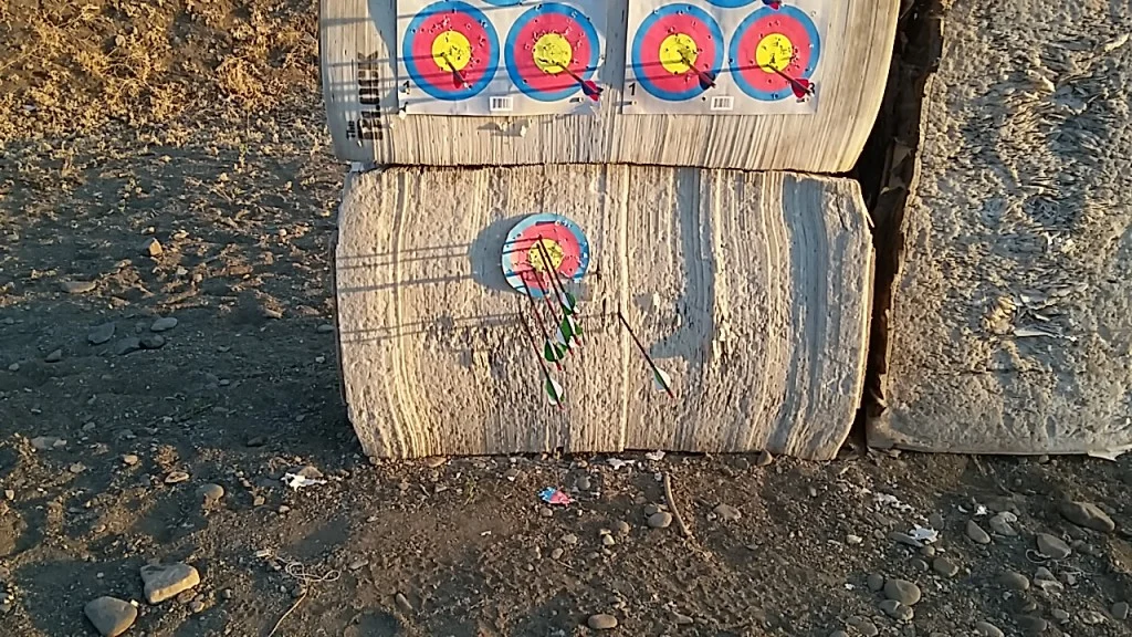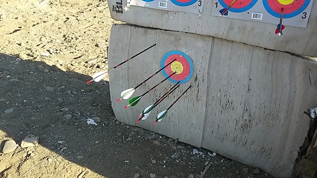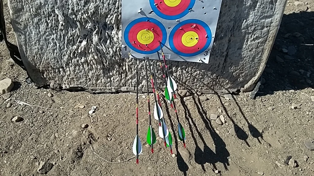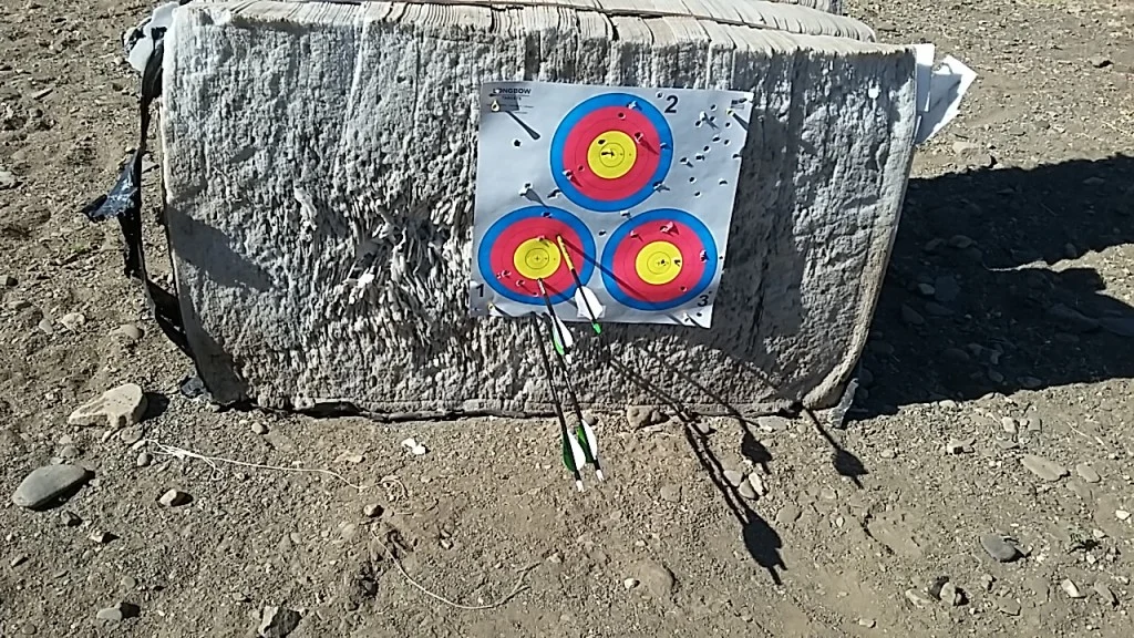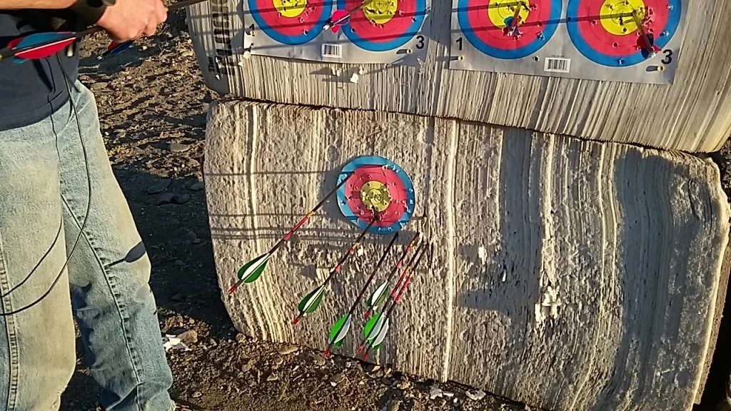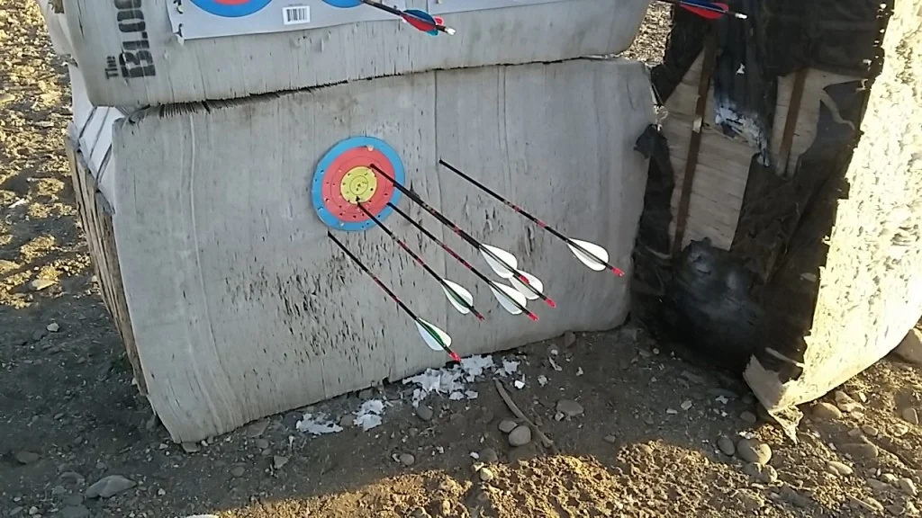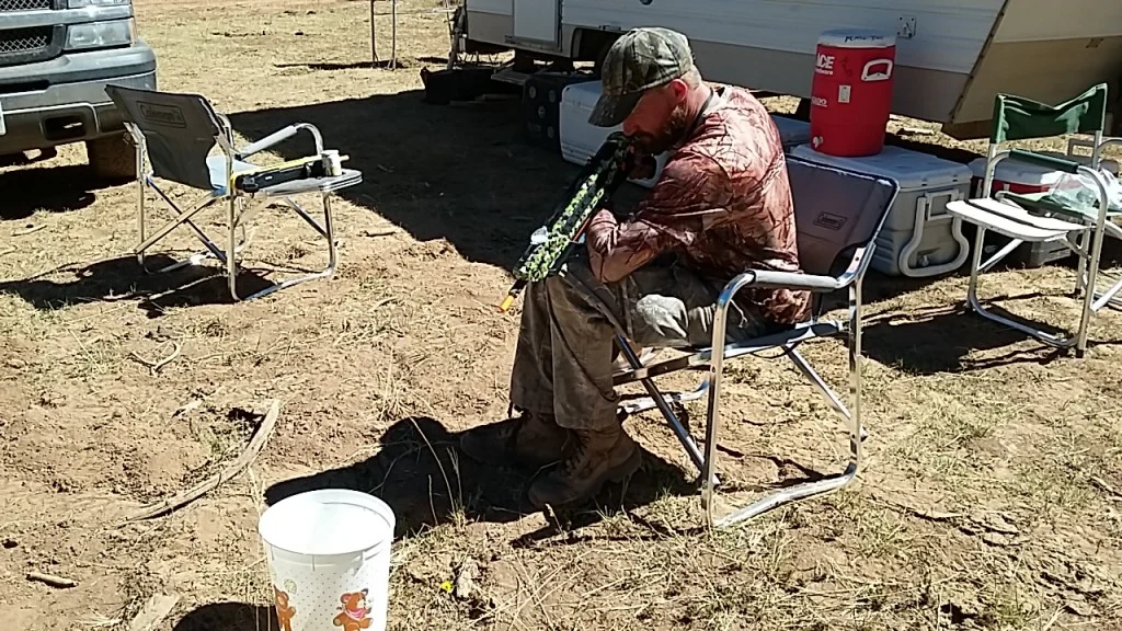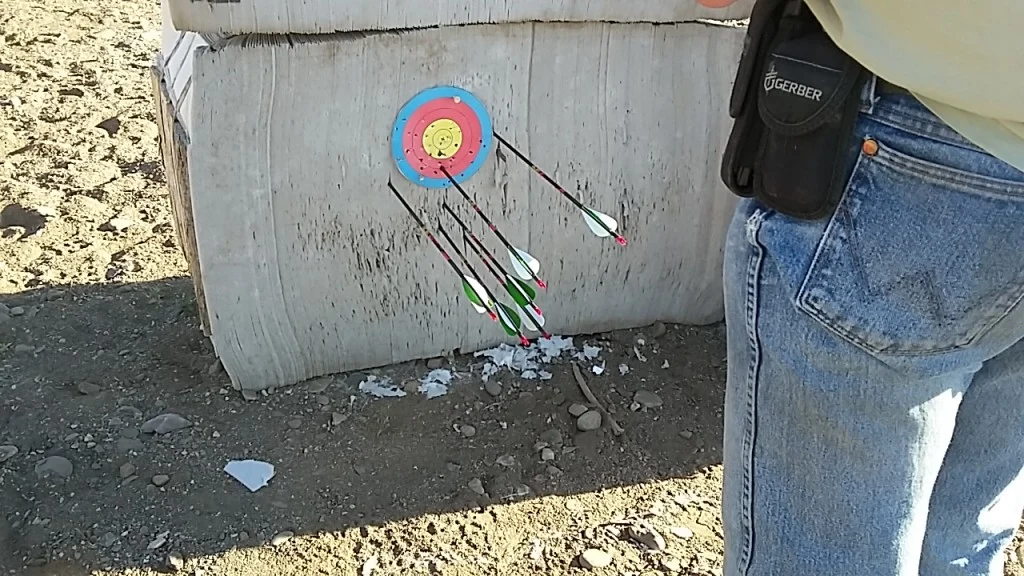 I practiced pretty regularly every other evening, shooting mostly from the 30 yard mark and shooting about 100 arrows a time.  Always being pushed to practice by Weasel.  If the weather was too hot or windy or whatever, I would practice standing out in the street and shooting into a bale in the back of the garage.  25 yards was about as far back as I could go which is still good practice.  I can’t say I didn’t have some arrant arrows that caused a hole or two in the sheetrock and you have probably read about my ruining 3 brand new arrows when I tried to shoot from across the street at closer to 30 yards and smashed into the backside of the bricks.  So, most of my practice sessions were pretty good and when Sherry would ask me about my session, my comment usually was, “a deer or elk is going to be in trouble”…My confidence level continued to rise with each practice session and I owe it all to the Fixed Crawl method of shooting.  It is now my “form” of shooting and all my backup strings are set the same way.
