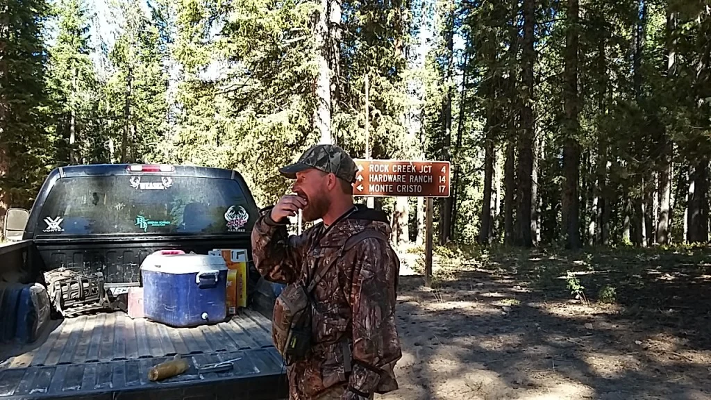 As for the evenings, as hot and dry as it has been all summer and the fact that water is at a premium up in the woods, we decided we would find a water hole or two and sit in an area close to it until dark.  Our hopes were for a big buck or a spike/cow elk to come in while there was still enough light to get a shot.  Spot and stock in the morning, rest back in camp during the heat of the day and then sit on a water hole in the evening.  I think 90 percent of the hunters on the mountain did that same routine and so, we probably shared some of the water holes with others and didn’t even know it.
