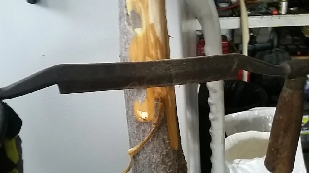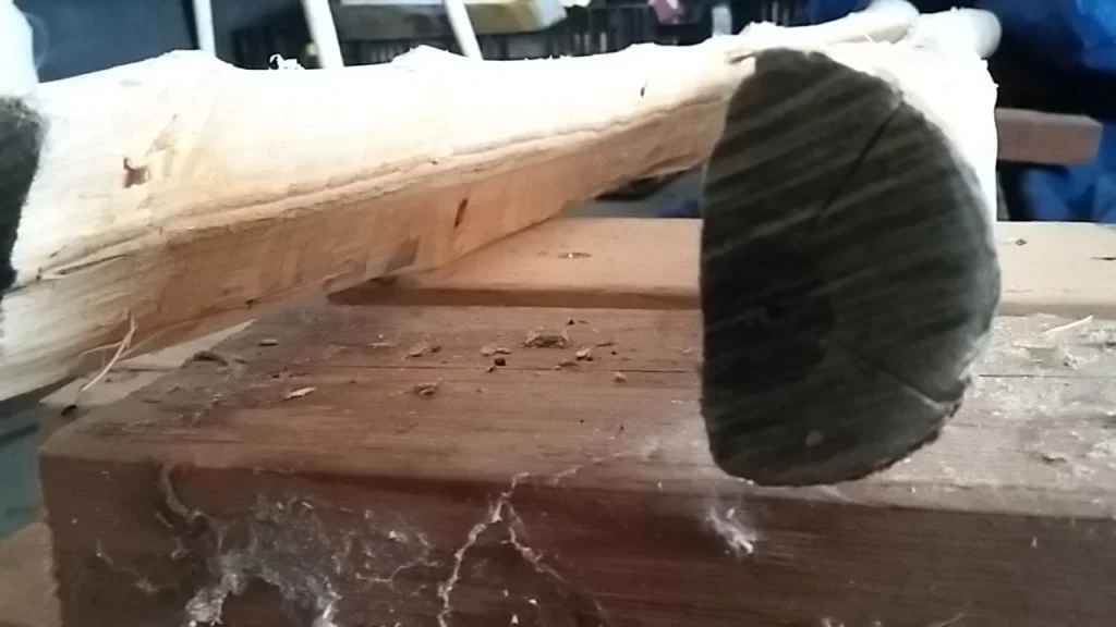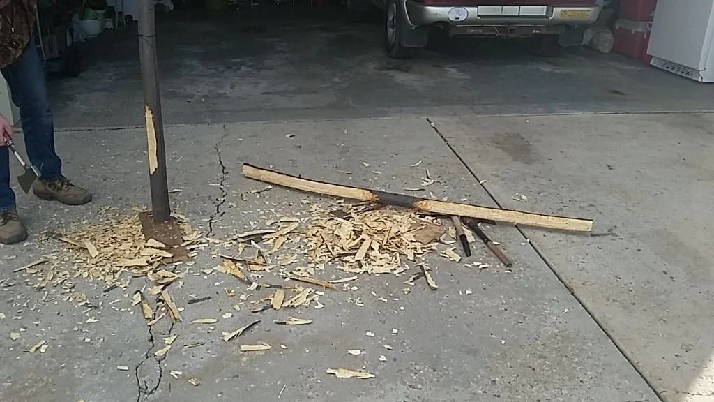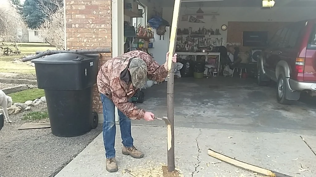 One afternoon, Weasel and I had just fixed up a couple of ground blinds for that evenings hunt and had a couple of hours to kill before we cooked and ate our supper.  So what better to do while sitting around than to make ourselves a self bow and go hunting some wild game yellow jackets.  We made the self bow out of pine and the string was a four strand continuous loop.  The arrow was fashioned after a single bevel point and not fitted with fletchings.  We needed to shoot straight out without interference from the bow hand or riser, so we chose to shoot bare shaft.  The brace height was set at 4 inches with a draw length of 10 inches.  The draw weight was not actually calculated, but we figure it was around a pound.  More than adequate for Yellow Jackets.