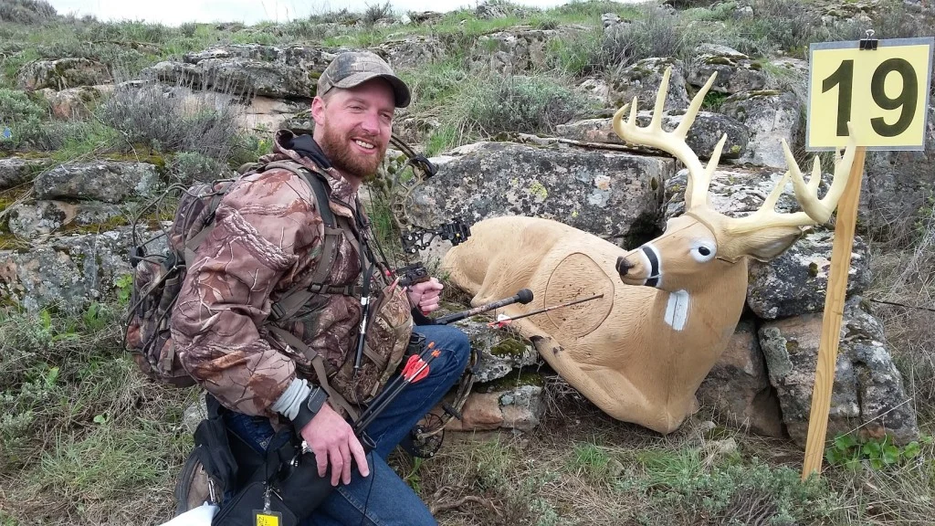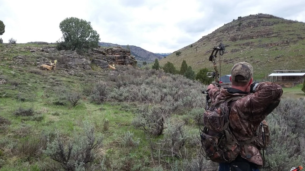 The course lends itself well to “real shooting” situations if one is inclined to hunt big game with their arrow flipper. Of course if a big old mule deer buck was laying where this one is on the left, you would not hesitate to shoot a broad head yielding arrow at it if you were within your shooting and hitting range. I would have to be about 1/3rd closer in real life to take this shot, but a miss would mean a busted or lost arrow, a hit would mean liver and onions would be served soon!