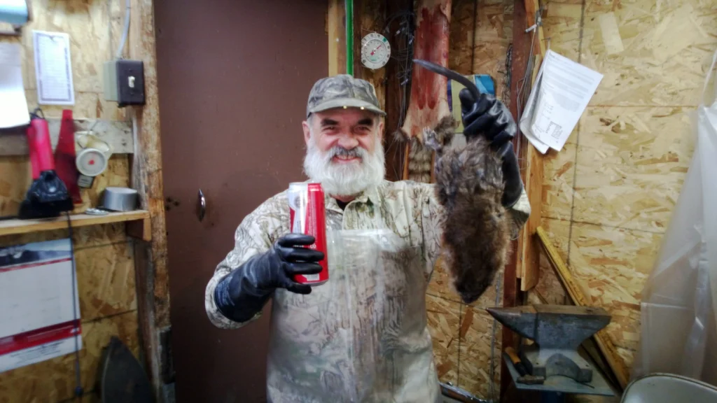 So, I ended up at the skinning shed with 12 rats! Bob only had 2 and Weasel (On a Roll) caught one! A 15 rat day! We’ll take it! I had one live trap tipped up on its top so the critter that tried to get into it tripped the door and then continued to try and get the rat body out of it, unsuccessfully.