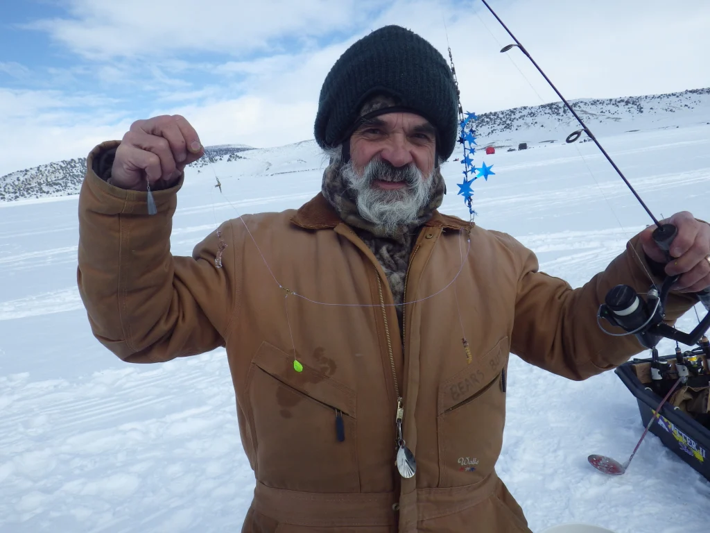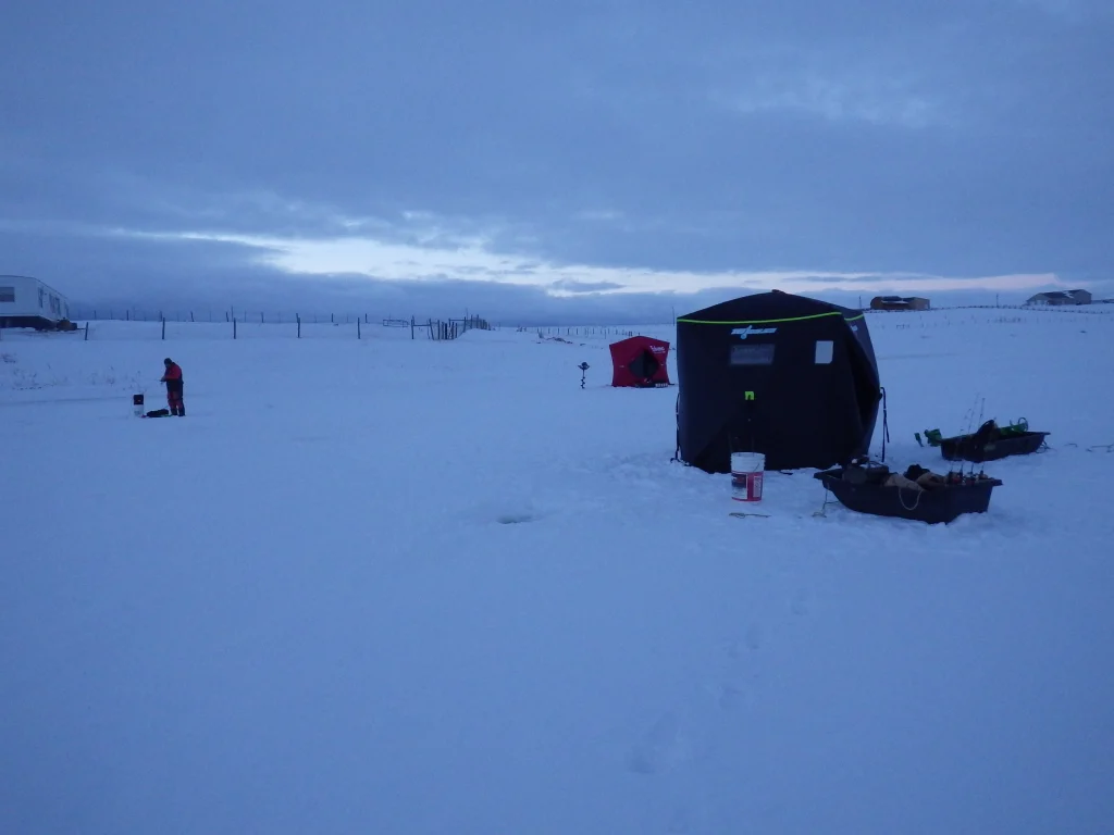Once we were on the ice, we had several other groups come and join around us to share the area. More is better in my opinion and of course those guys knew what to use and so they caught a whole heck of a lot more fish than we did. They were not stingy on letting us know the secret, but when you are 15 miles from the nearest place that carries the secret lure, you are pretty much at your own imaginations’ mercy as to how to get the fish to bite. I even tried my newly thought up, blue fan-dangle….