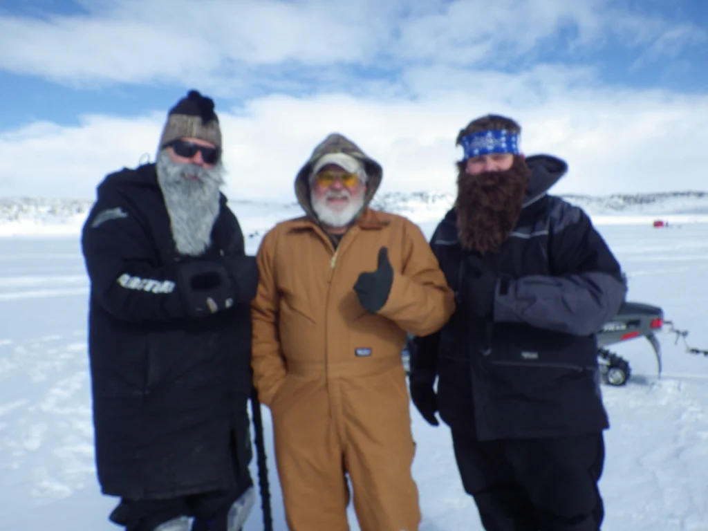 Here a couple of bearded guys from the Duck Dynasty group joined our Sulpher Creek friend and mentor, WyoGoob (middle) and even though they didn’t grow those beards themselves, the beards did save their faces from a good wind burn. Thanks guys for joining in the fun! AND for towing our sleds off the ice when the tourney was over!